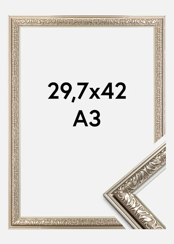 Носталгия е стилна сребърна рамка в ретро стил с красиви орнаменти. Подходяща е, когато търсите широка ретро рамка за вашите най-хубави снимки.