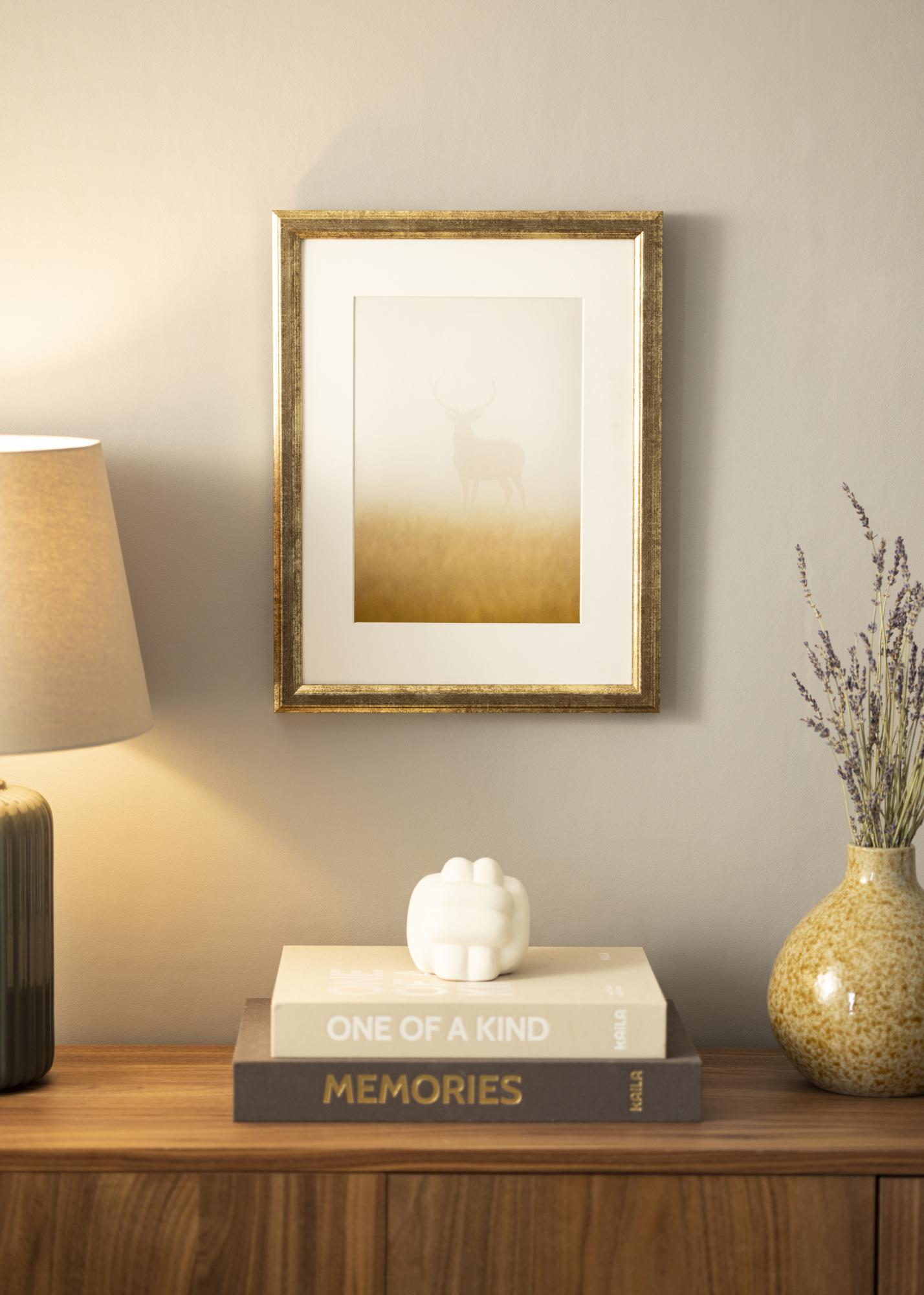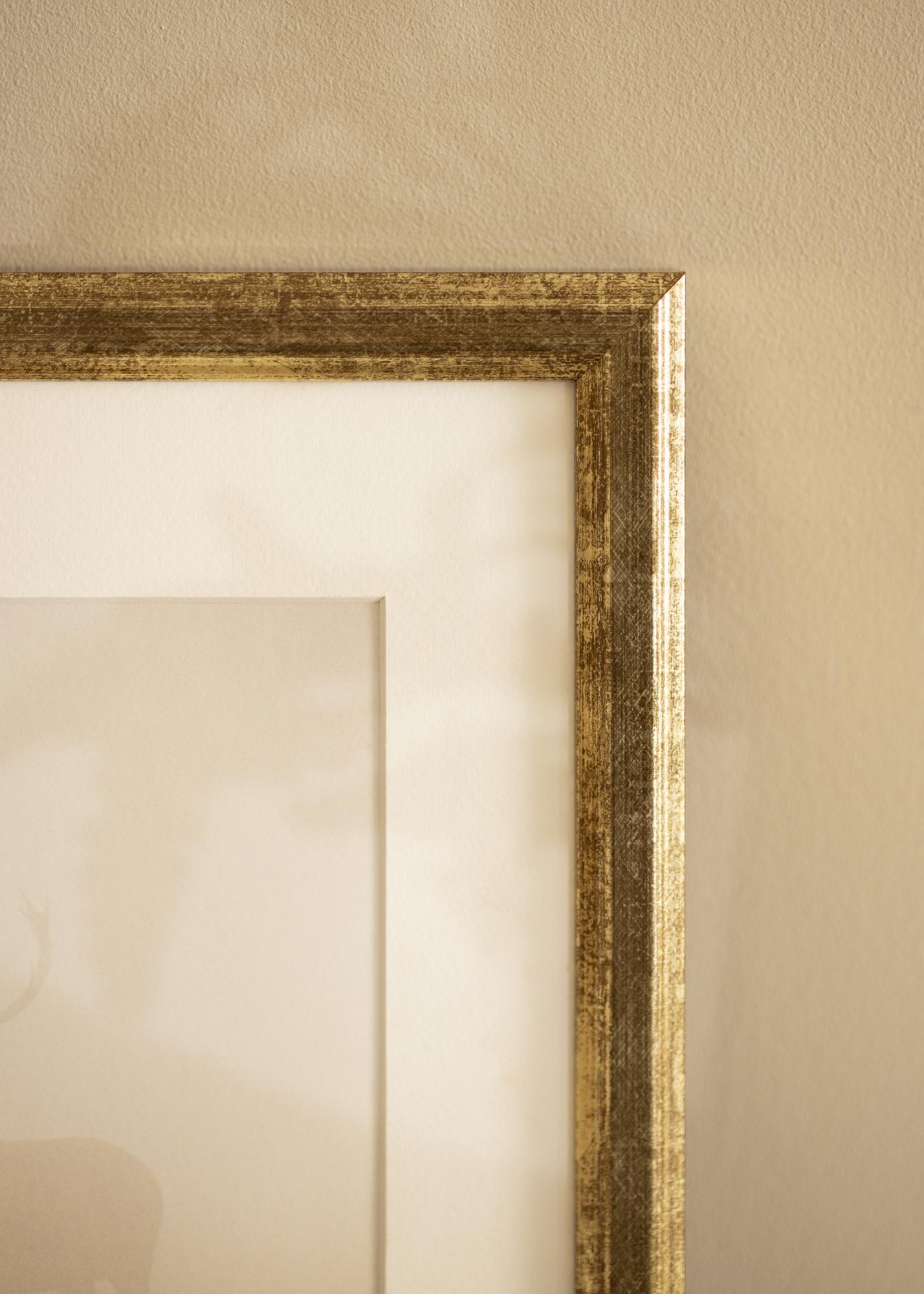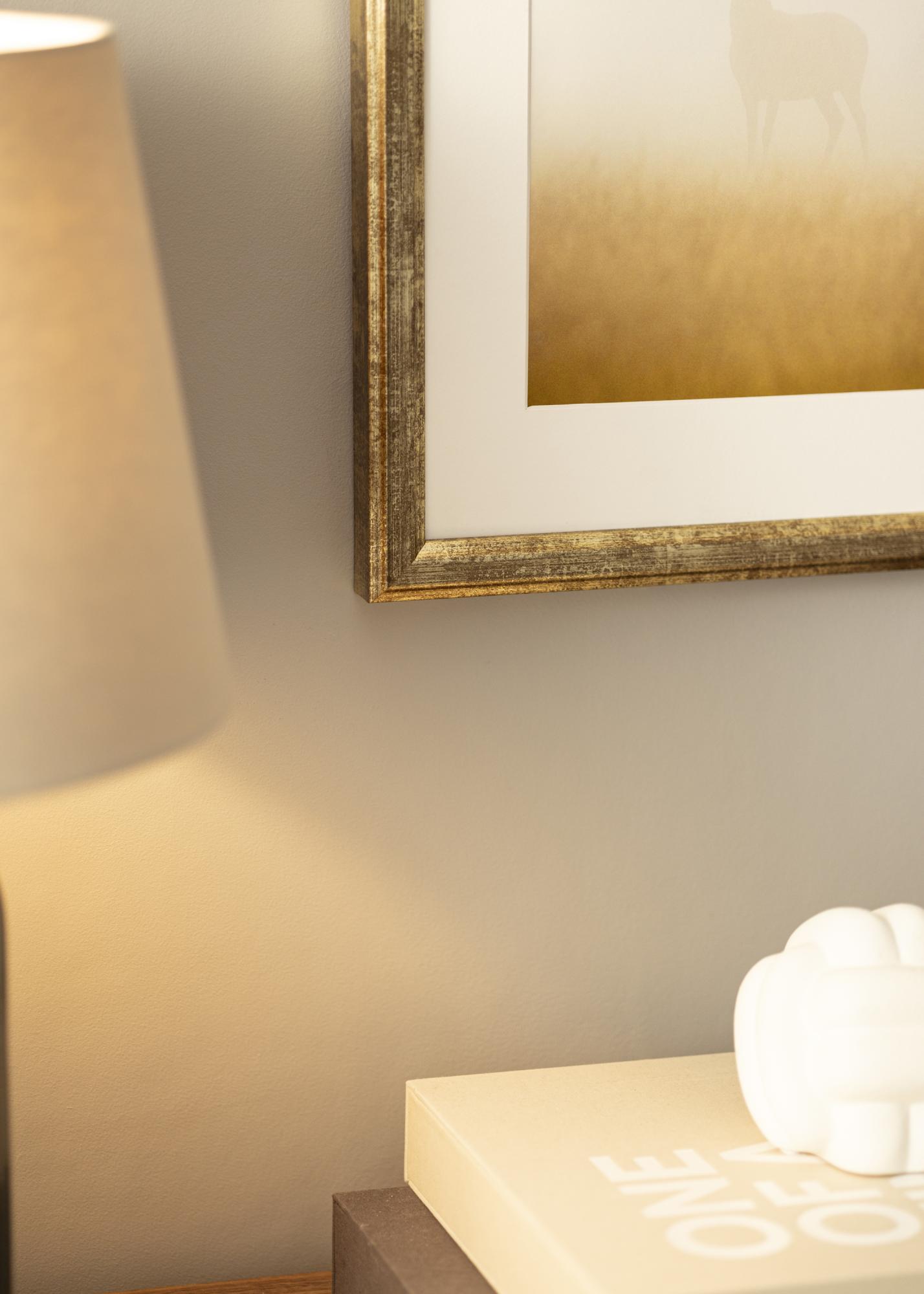 Рамка Nyhyttan Антично Злато е елегантна и универсална рамка за снимки, която се произвежда в нашата собствена рамкова работилница. Със своя изящен златист цвят и антично патинирана повърхност, тази рамка предлага деликатна структура, която придава рустикално усещане. Износената финитура се комбинира с елегантни ръбове, за да създаде вечна рамка, перфектна за произведения на изкуството и фотографии с класически или винтидж характер.