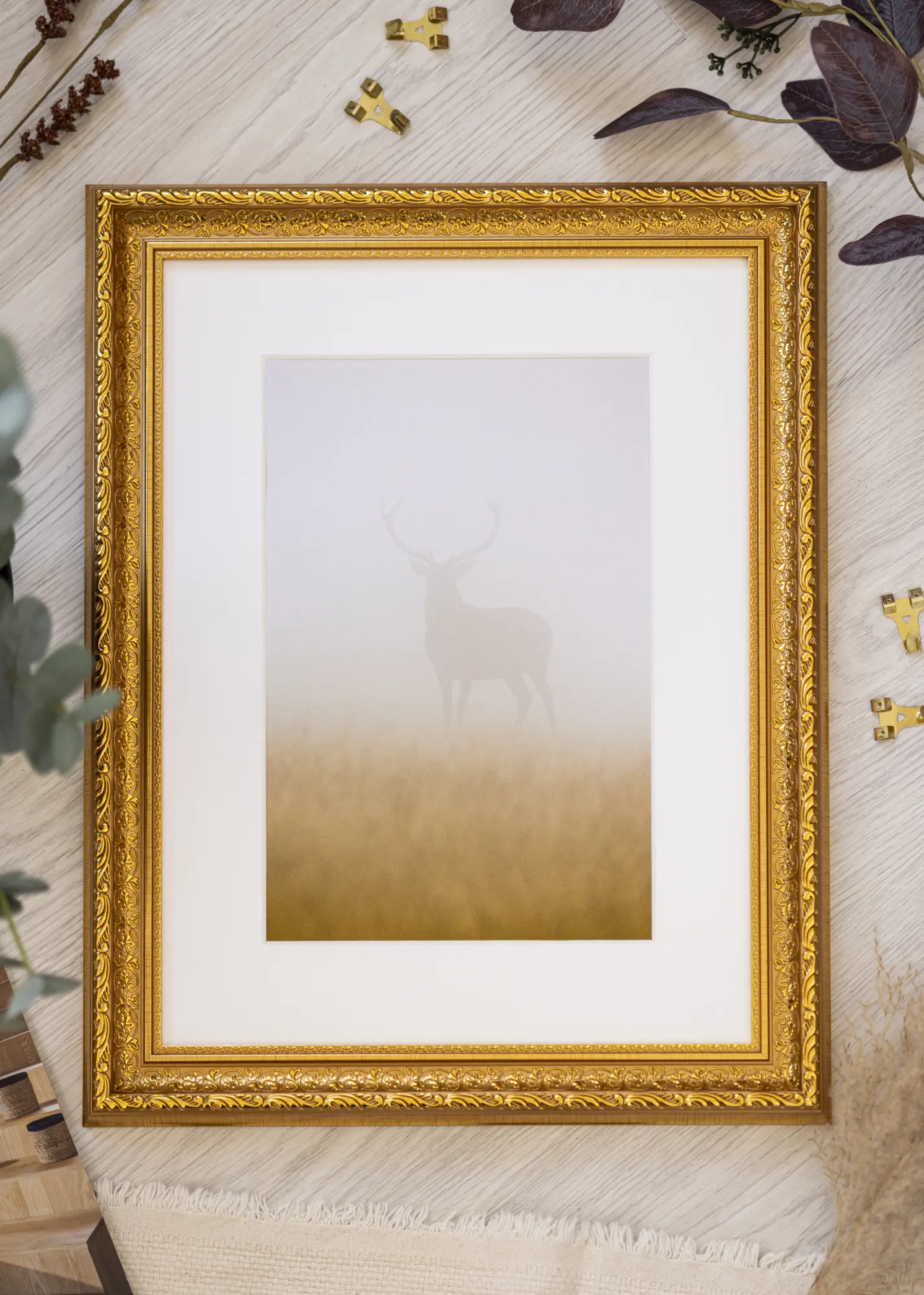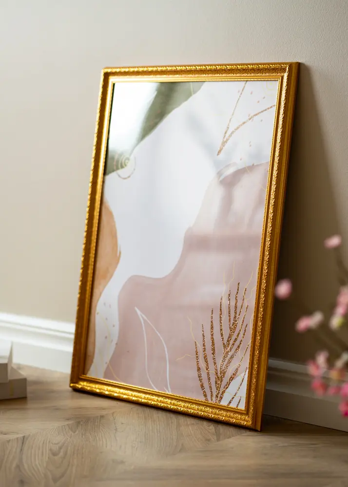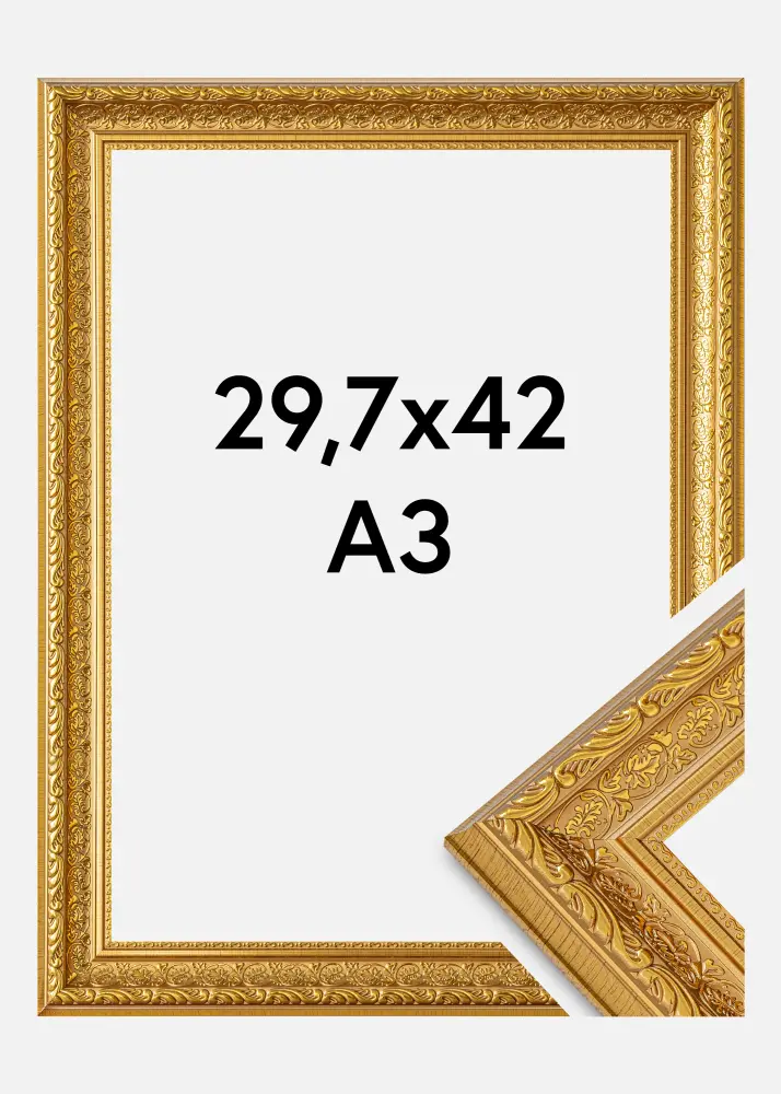 Превърнете стените си с фоторамка, която излъчва елегантност и стил. Тази рамка в златист цвят е перфектна комбинация от класически орнаменти и красиво детайлизирана профилна линия, която придава луксозно усещане на вашия дом. С размери 29,7x42 см (A3) е идеална за показване на произведения на изкуството, фотографии или дипломи, които заслужават да бъдат в центъра на вниманието.