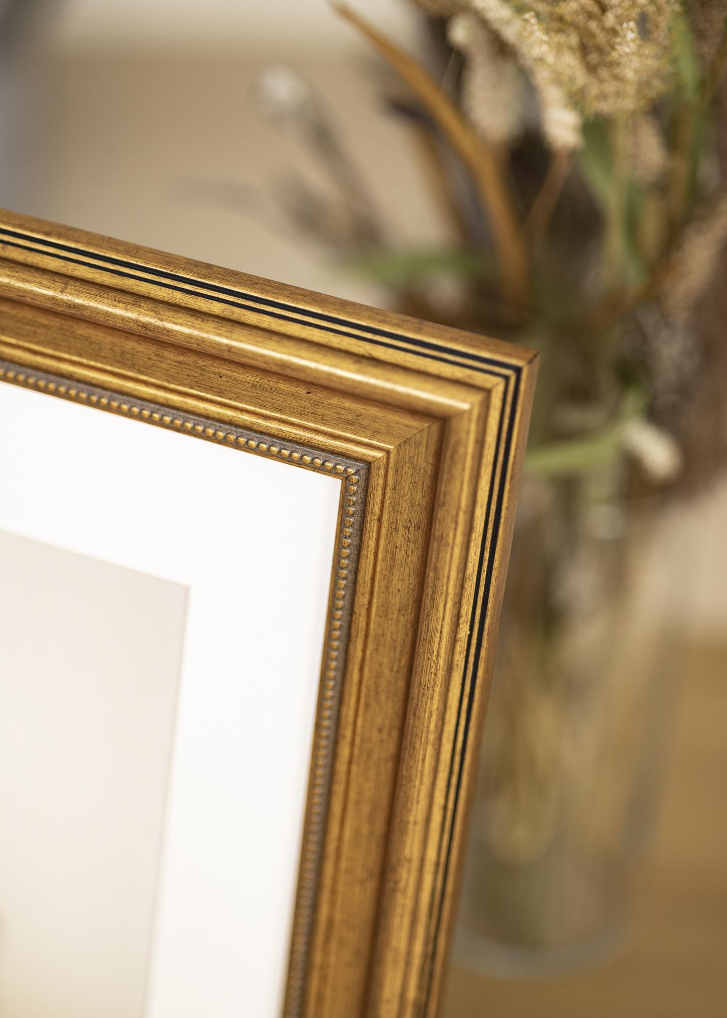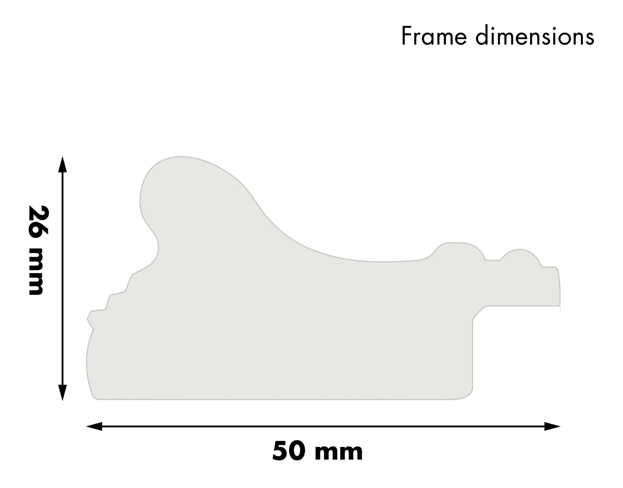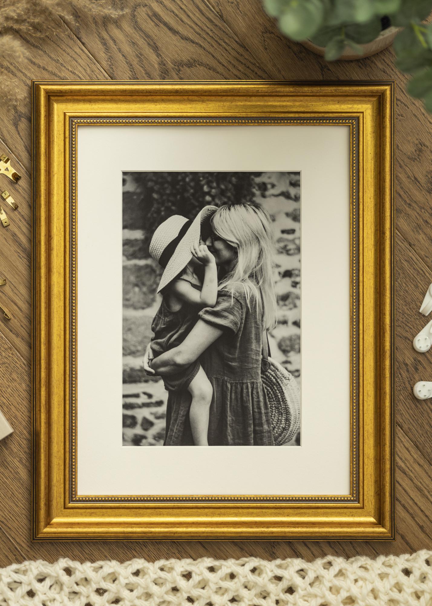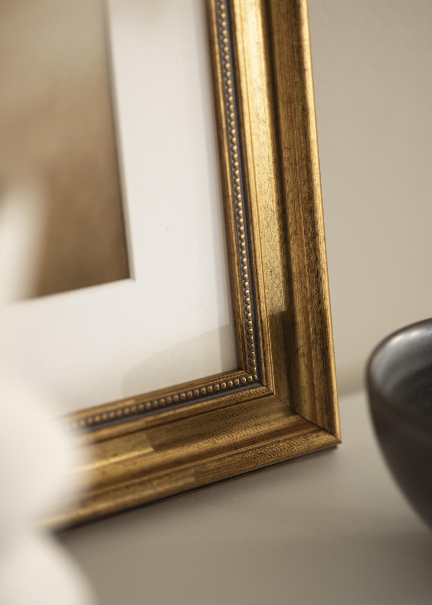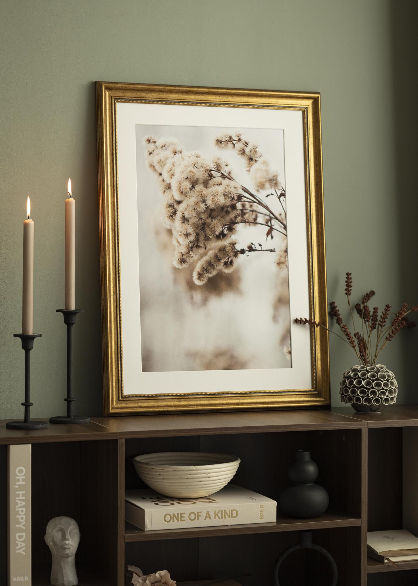 Рококо е рамка в златист цвят, която придава прекрасно винтидж чувство на всичките ви любими мотиви. Рамката има 50 мм ширина в нюанс на лъскаво антично злато, както и красиво износена повърхност, която подчертава класическия външен вид на рамката. Рамката е подходяща както за лични фотографии, така и за абстрактни плакати – и независимо кой мотив изберете, можете да го поставите безпроблемно. Просто освободете задната част на рамката, която се държи на място от малки гъвкави щифтове, и след това поставете изкуството си до стъклото на рамката.