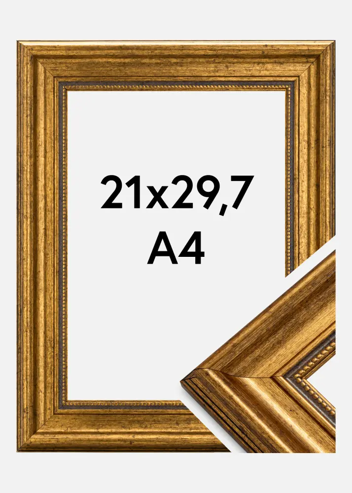 Дайте на вашите снимки кралска рамка с тази величествена 21x29,7 см (A4) фоторамка. Нейният профилиран широк златен обков в рококо стил придава луксозно и класическо усещане на интериора ви. С рамка, която измерва цели 50 мм в ширина, вашето произведение на изкуството или снимка ще стане гарантирано център на внимание в стаята.