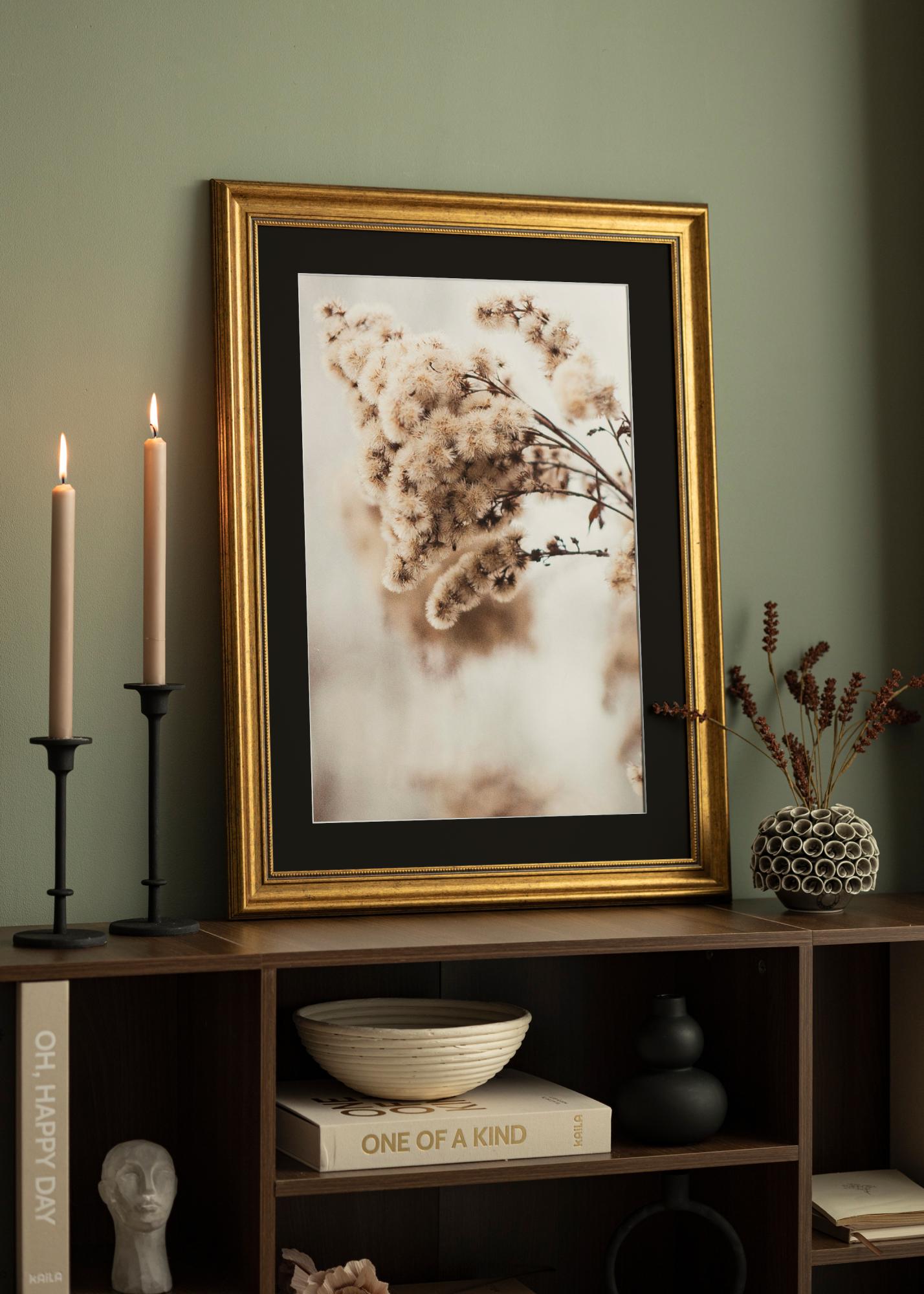 Създайте величествена домашна галерия с тази златна рамка и черен паспарту – комбинация, която обещава да даде на избрания от вас мотив вниманието, което заслужава.