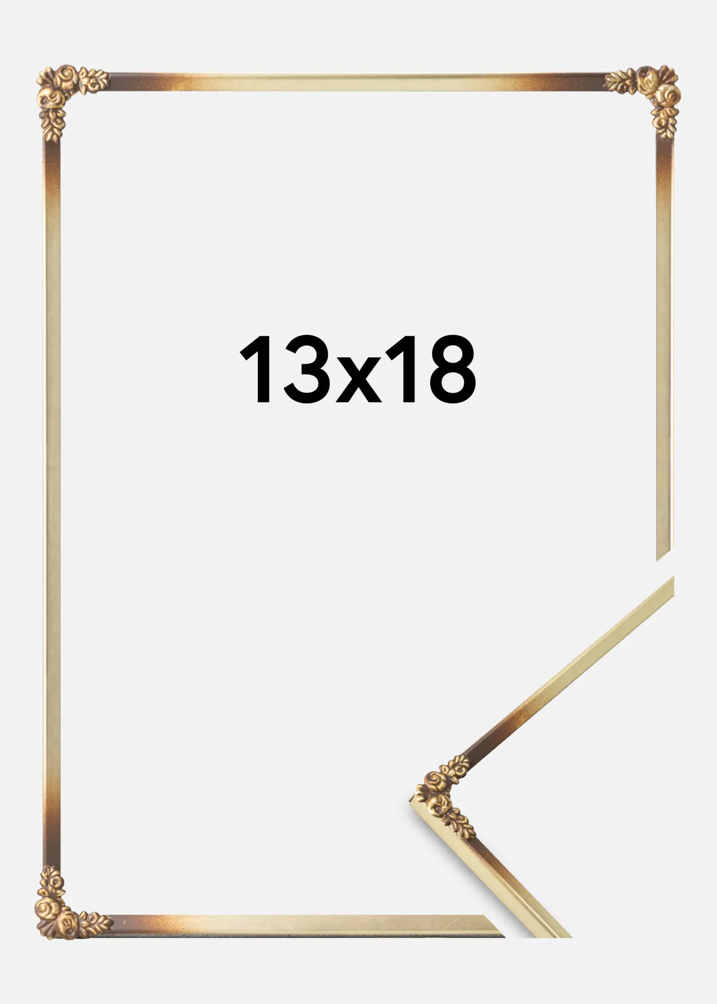 Розов Метал Злато е класическа рамка, която придава изискана рамка на всичките ви мотиви. Всеки ъгъл е декориран с малки рози, които са леко "обгорени", за да получат правилната завършеност. Рамката е изработена от златист метал, което я прави здрава, като същевременно подсилва ексклузивното усещане, което рамката придава.