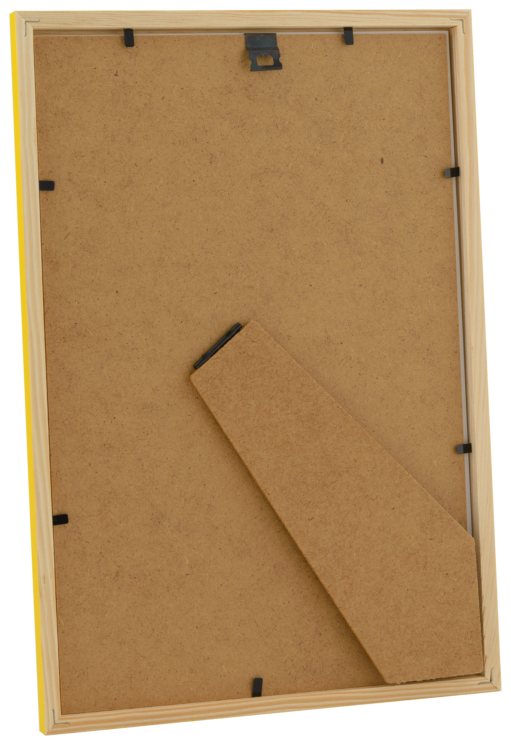 Тази рамка за картини има тънък профил, който е с 12 мм ширина и 12 мм дълбочина. На гърба има държачи за стена и гръб, изработени от MDF. Когато монтирате изображението си, освобождавате гърба чрез сгъваемите щифтове, които държат плочата на място, след което можете да поставите мотива си.