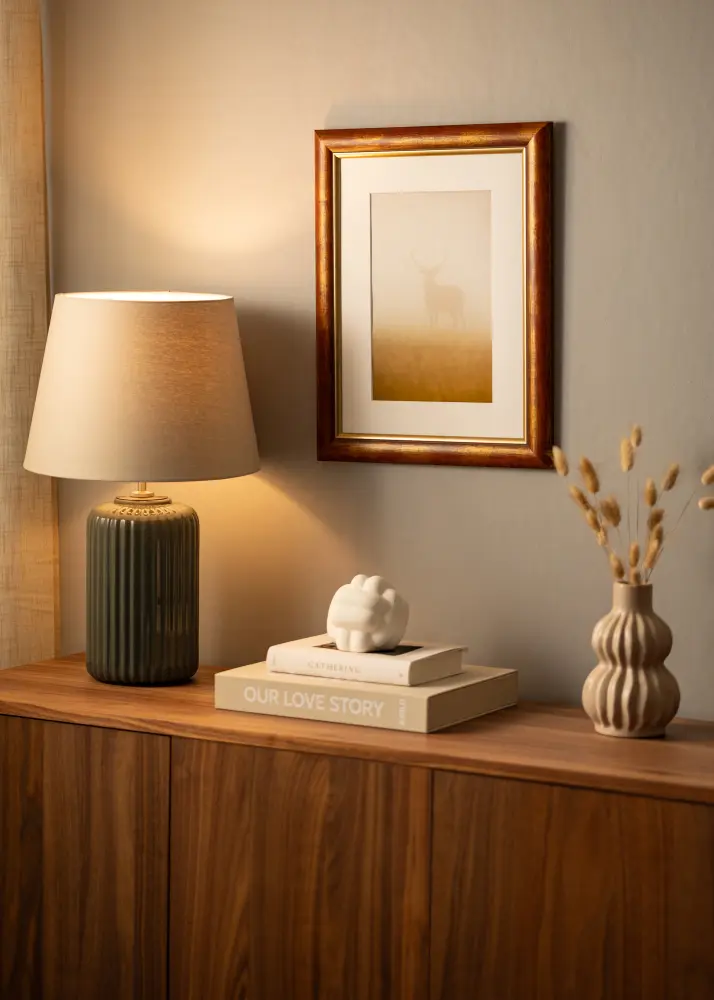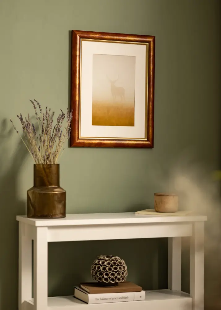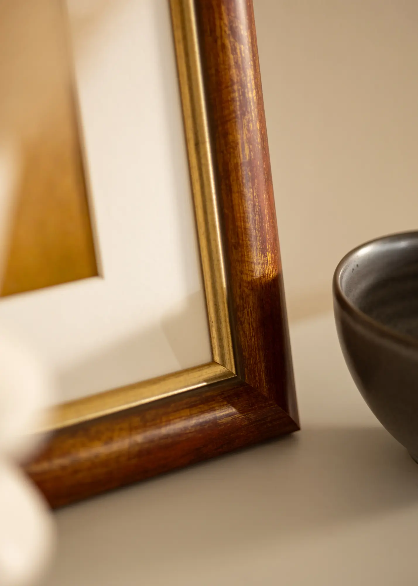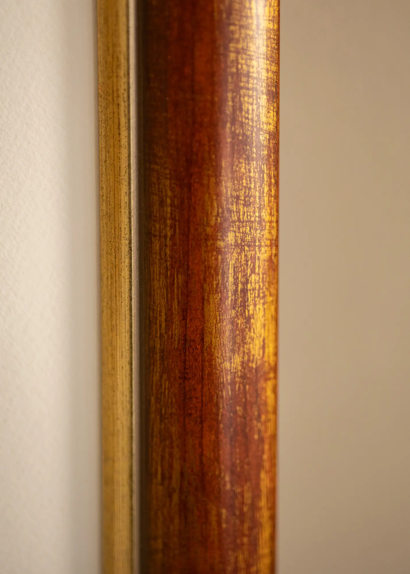 Вечна рамка от дърво, изработена във Финландия с елегантна червеникава дървесна повърхност и златен кант близо до мотива. Осигурява хармонично усещане към мотива. Рамката има широка профил от цели 41 мм и дълбочина от 19 мм, което придава допълнителна дълбочина на вградената рамка.