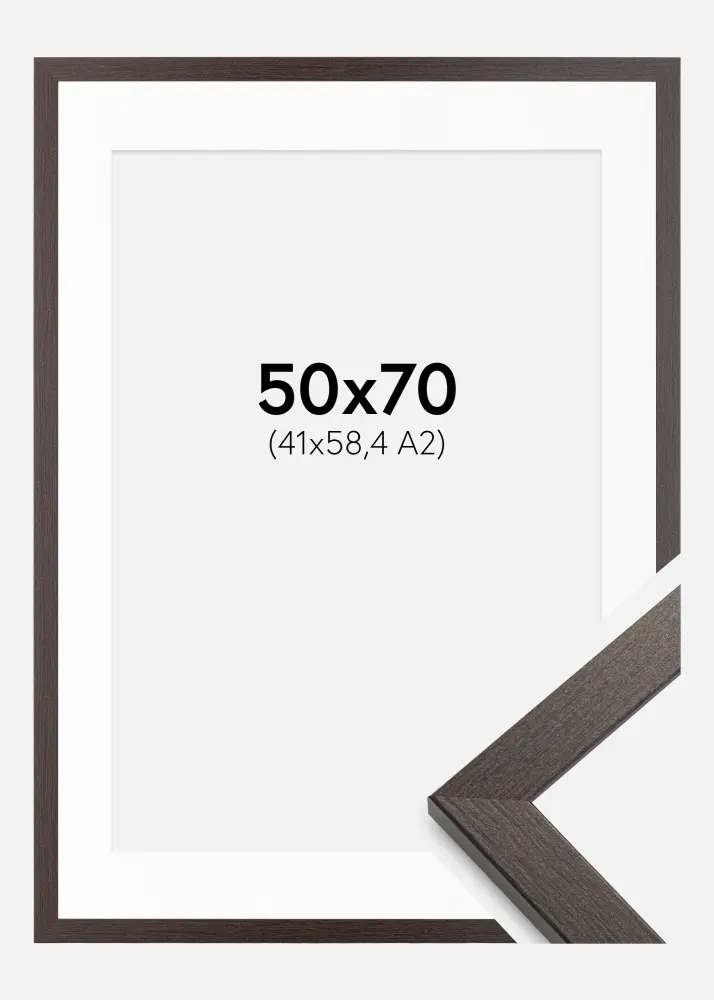 Рамката се доставя с бял паспарту, който обгражда вашите снимки по изискан начин. Паспартуто е приспособено за снимки с размер 42x59,4 см (A2), което създава красив контраст спрямо кафявата рамка и подчертава изображението по елегантен начин.