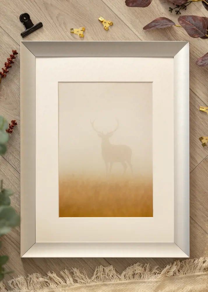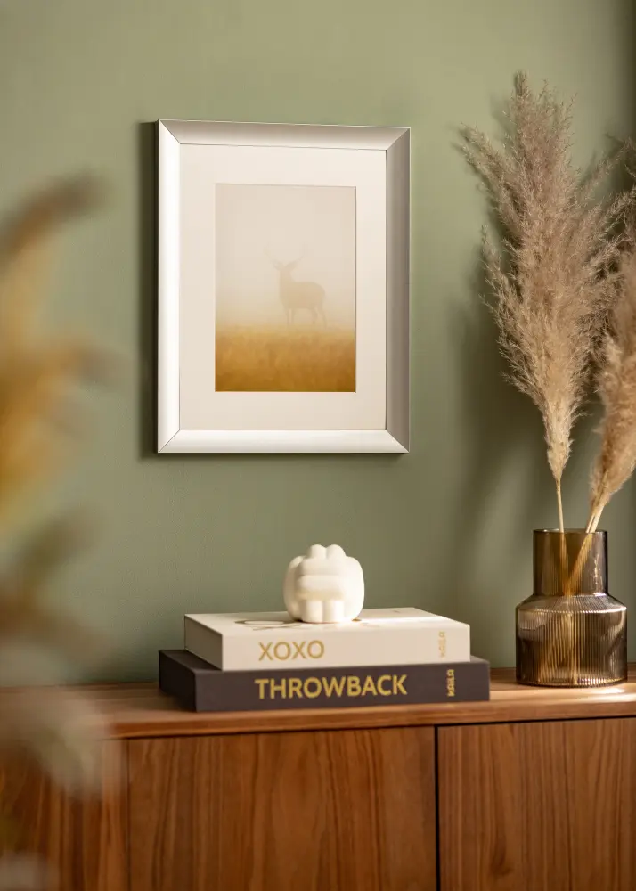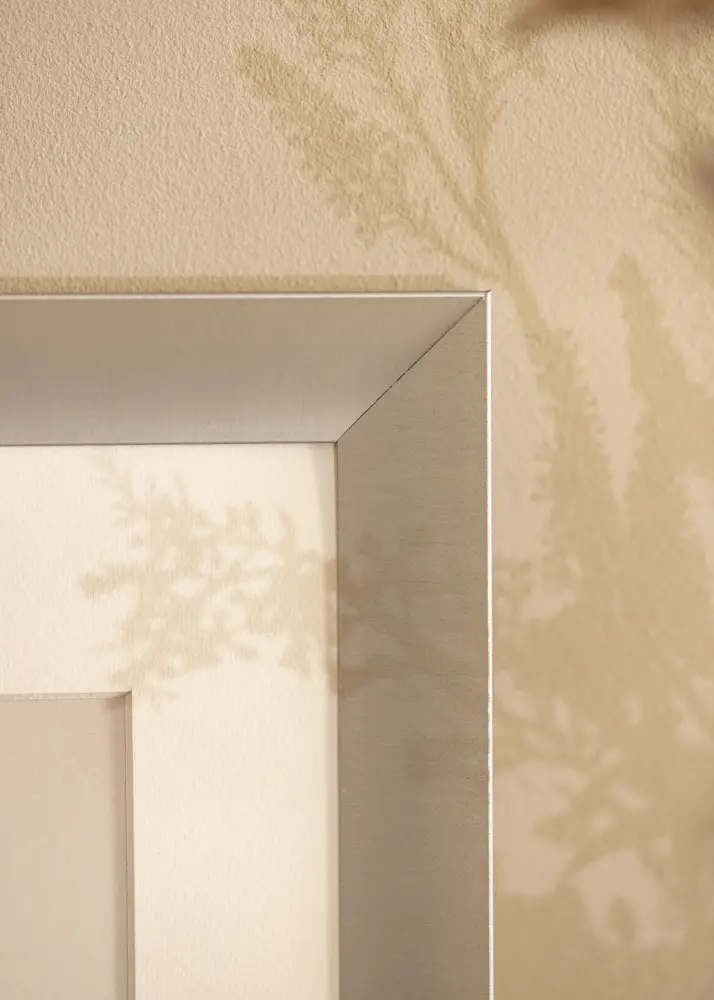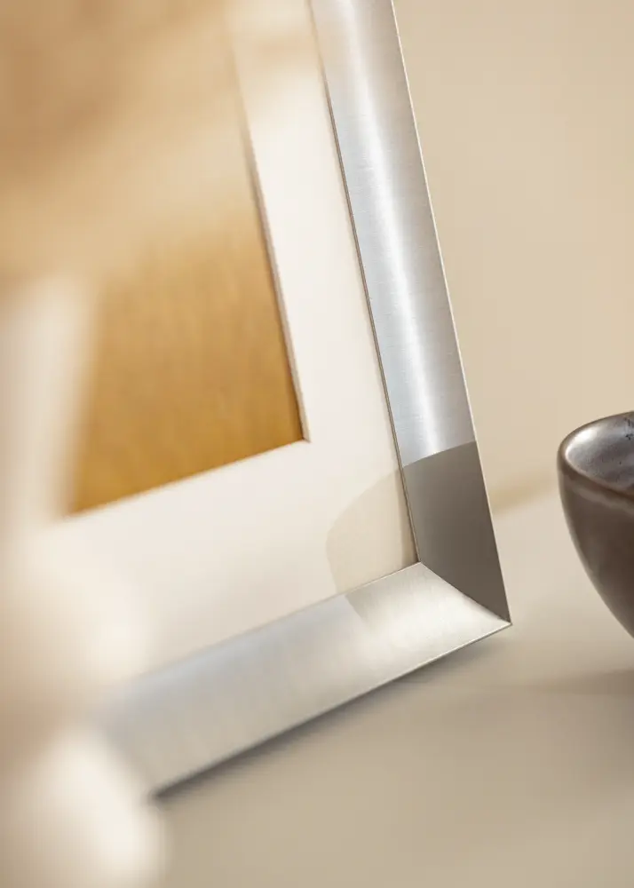 Елегантна рамка за картини в полуматов сребърен оттенък. Напълно подходяща за рамкиране на черно-бели фотографии и изображения в сиви тонове, но всички снимки изглеждат добре в рамката. Стилният вид в комбинация с дискретния сребърен цвят прави рамката подходяща за всички видове интериори и среди, но срещу ледено розова, светло зелена или пастелна стена рамката за картини изглежда особено добре. Допълнете интериора със сребърни предмети и графични детайли в черно.