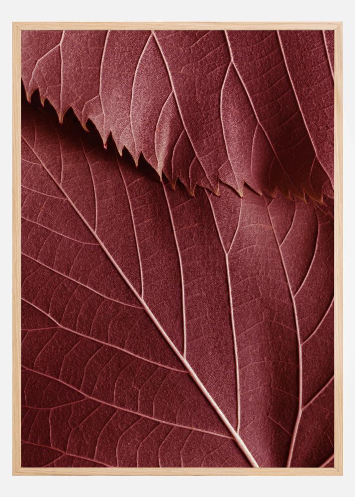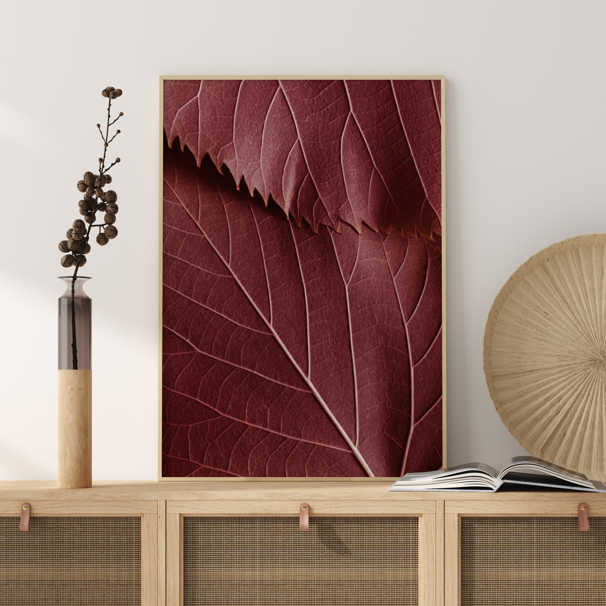 Ботаническа фотография на тъмночервени листа с живи шарки. Елегантен постер в топли нюанси, със стил, който го прави перфектен за комбиниране с други прекрасни мотиви на по-голяма стена с картини.