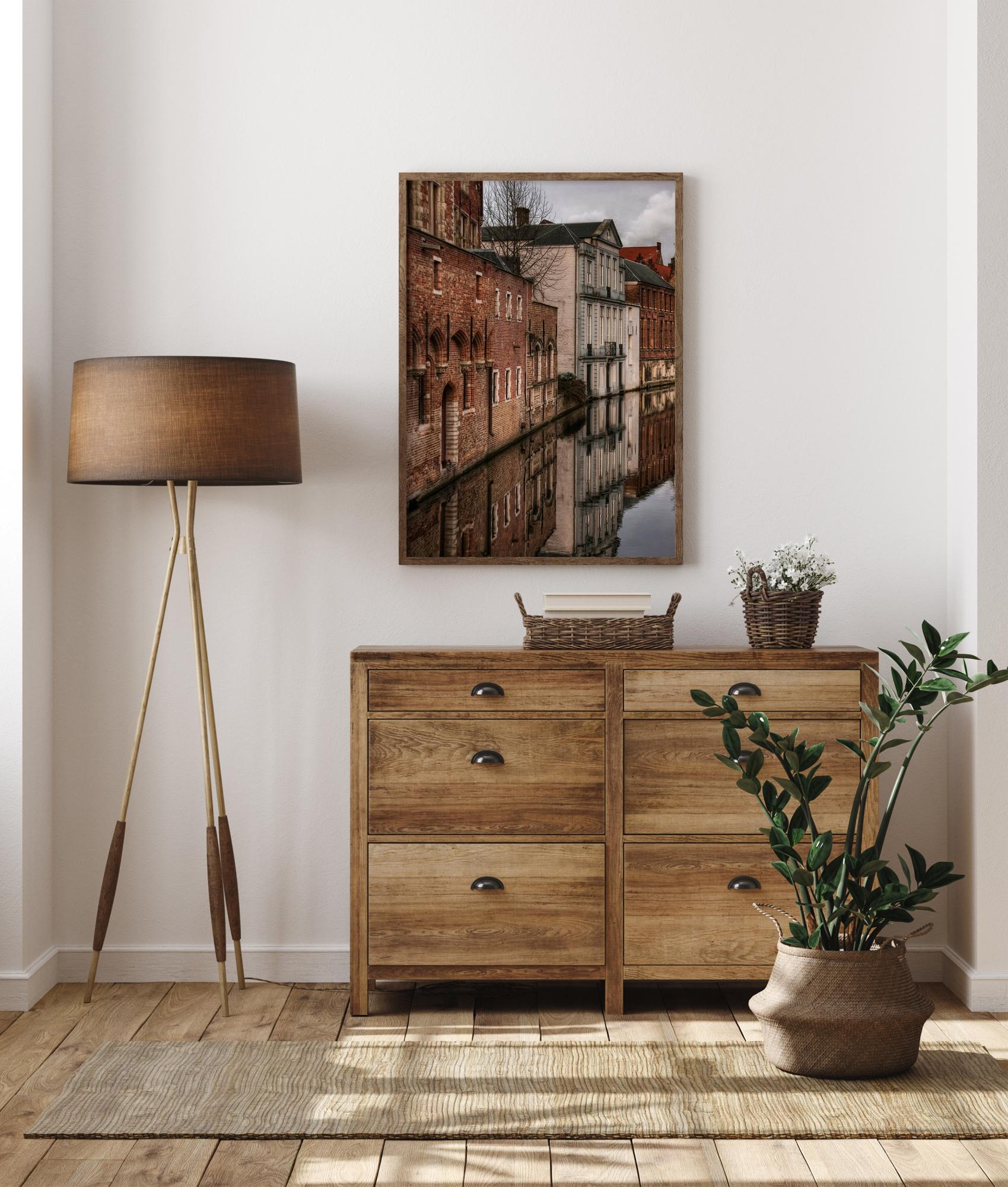 Носталгичен плакат с редове от стари къщи покрай река. Простите, рустикални, червени тухлени къщи и техните архитектурни детайли се отразяват в спокойната вода отдолу. Представете си, че плавате покрай тези сгради, докато размишлявате върху миналото.