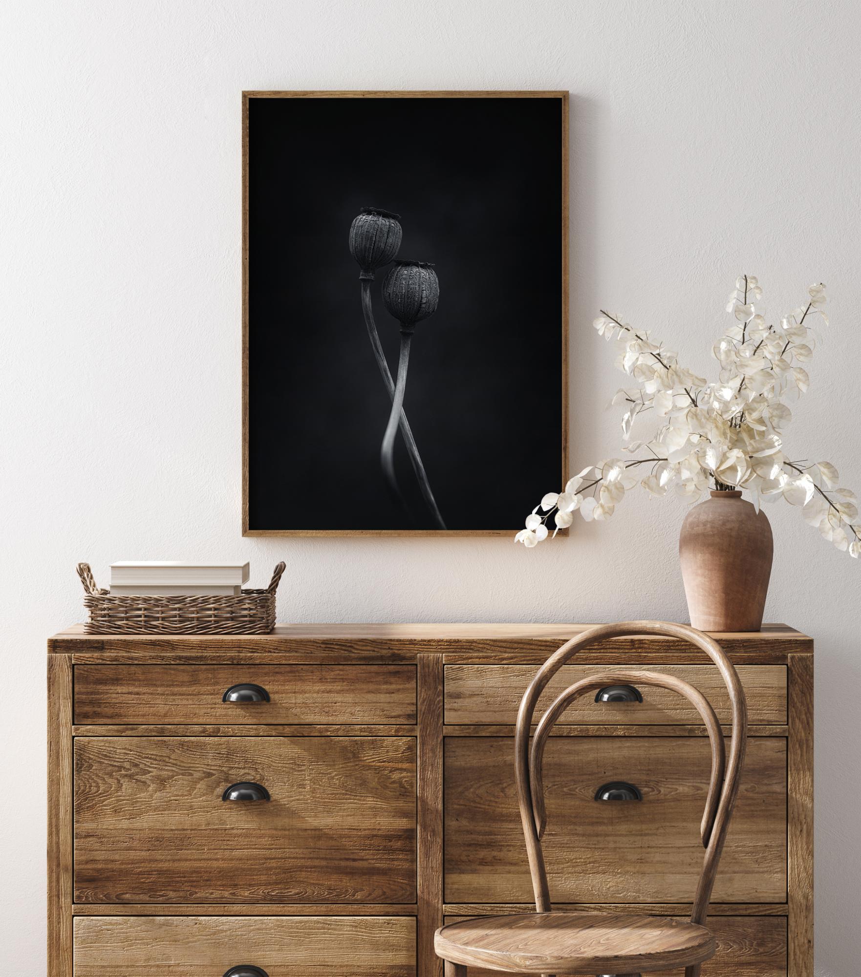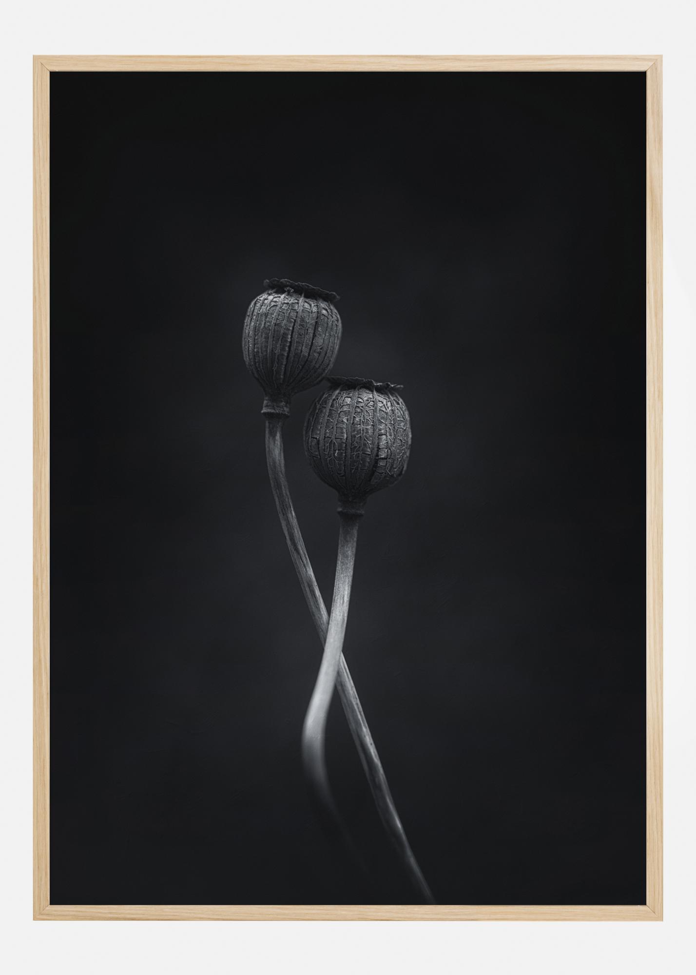 Подробен постер на природа с две преплетени семенни капсули от мак. Тази живописна снимка придава усещане за два танцьора. Почувствайте любовта и елегантността, когато закачите този постер у дома.