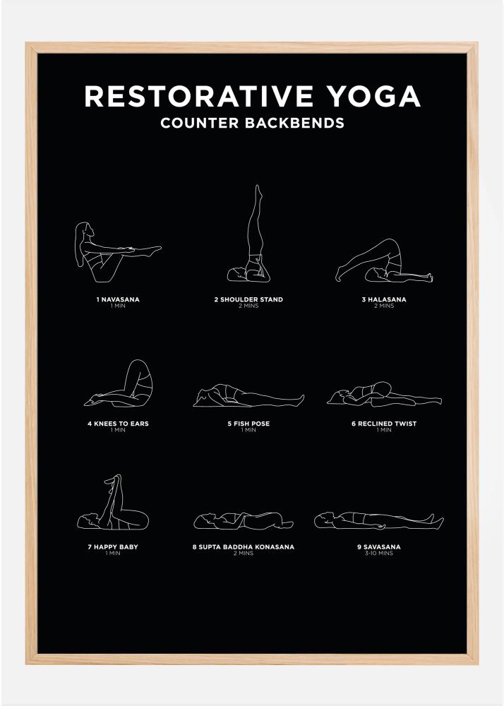 Научете се да се отпуснете с Ресторативна йога. Този стилен постер не е само красив интериорен детайл, той също така ви дава конкретни инструкции за позициите в този релаксиращ йога стил.