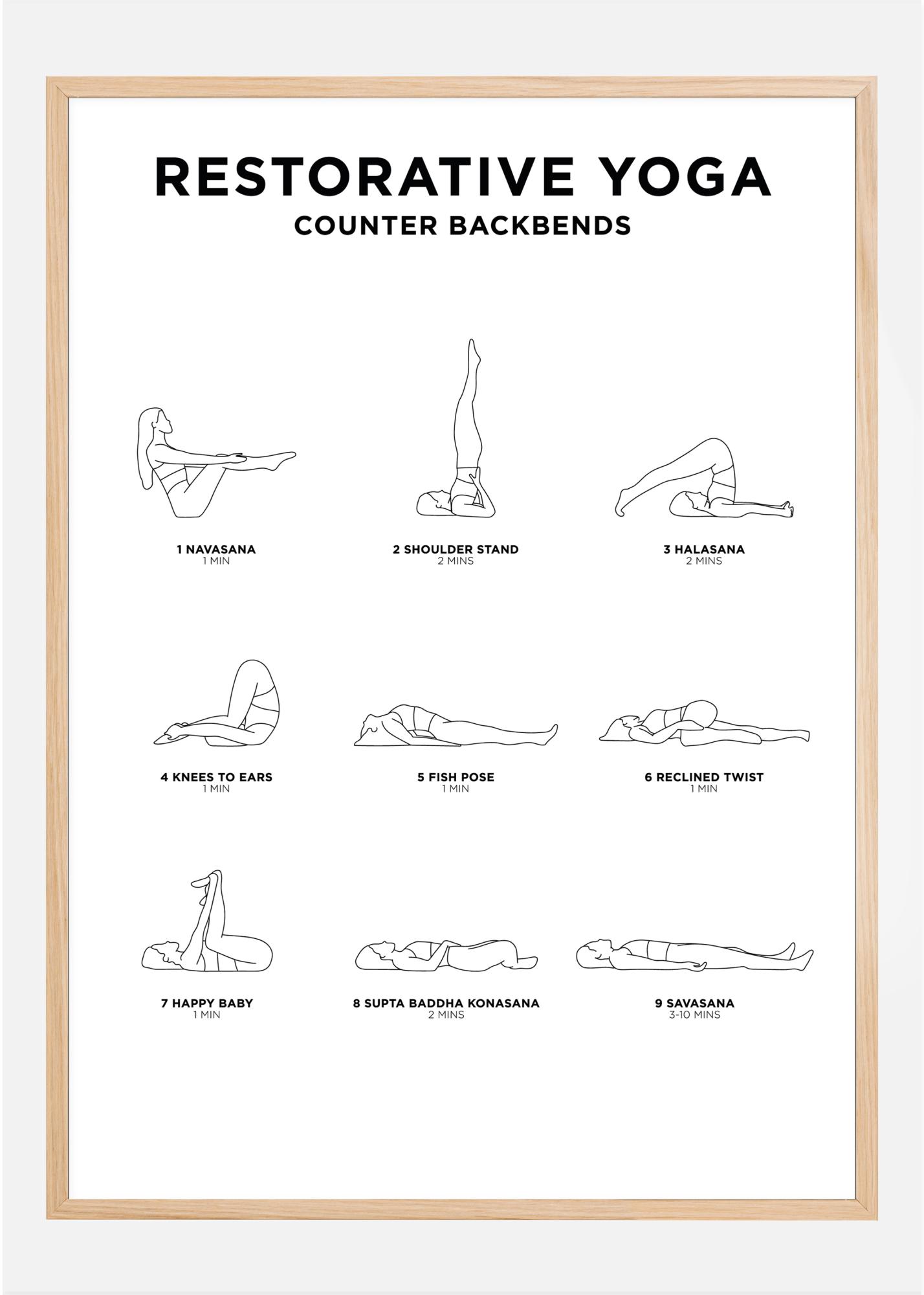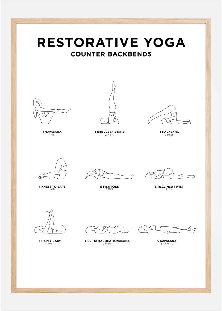 Научете се да се отпуснете с Възстановяваща йога. Този стилен плакат не е просто красив интериорен детайл, той също ви дава конкретни инструкции за позициите в този релаксиращ йога стил.
