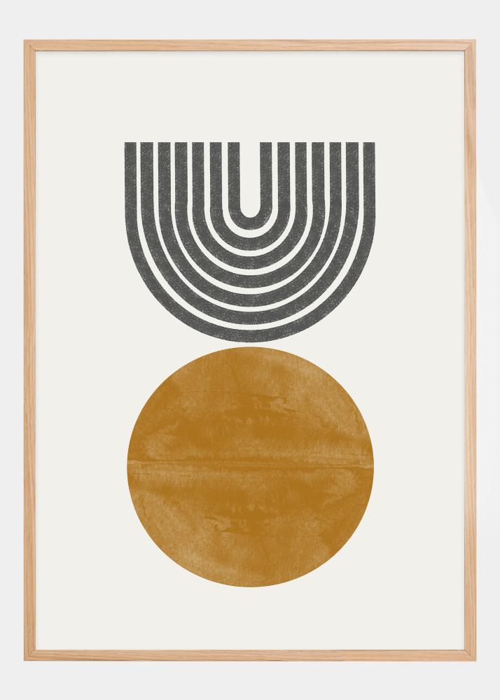 Този ретро вдъхновен постер комбинира геометрична прецизност с органични криви, създавайки усещане за движение и ретро чар. Големият охра оцветен кръгъл обект в долната част осигурява силна основа, докато черно-белите дъги отгоре напомнят на звукови вълни или абстрактен пейзаж, което придава интересен контраст и дълбочина.