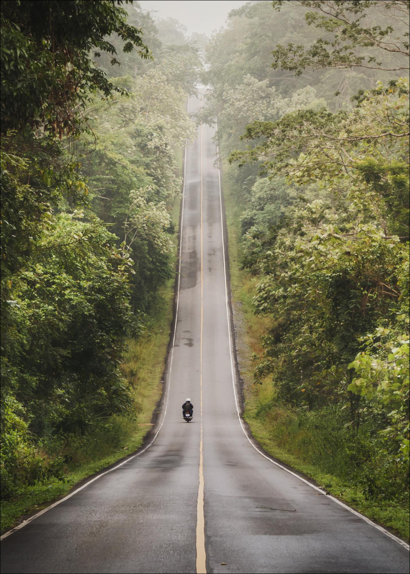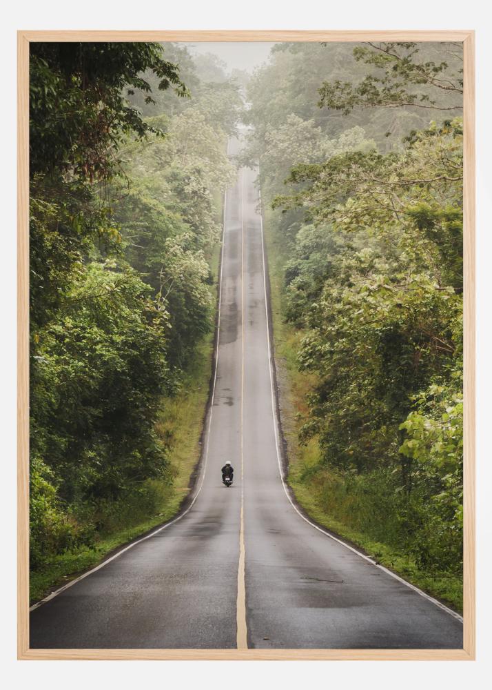 Тихо природна фотография на път с един сам моторциклетист, който прорязва в великолепната зелена зеленина. Спокойно и успокояващо плакатче, което изглежда чудесно заедно с други любими върху по-голяма стенна галерия.