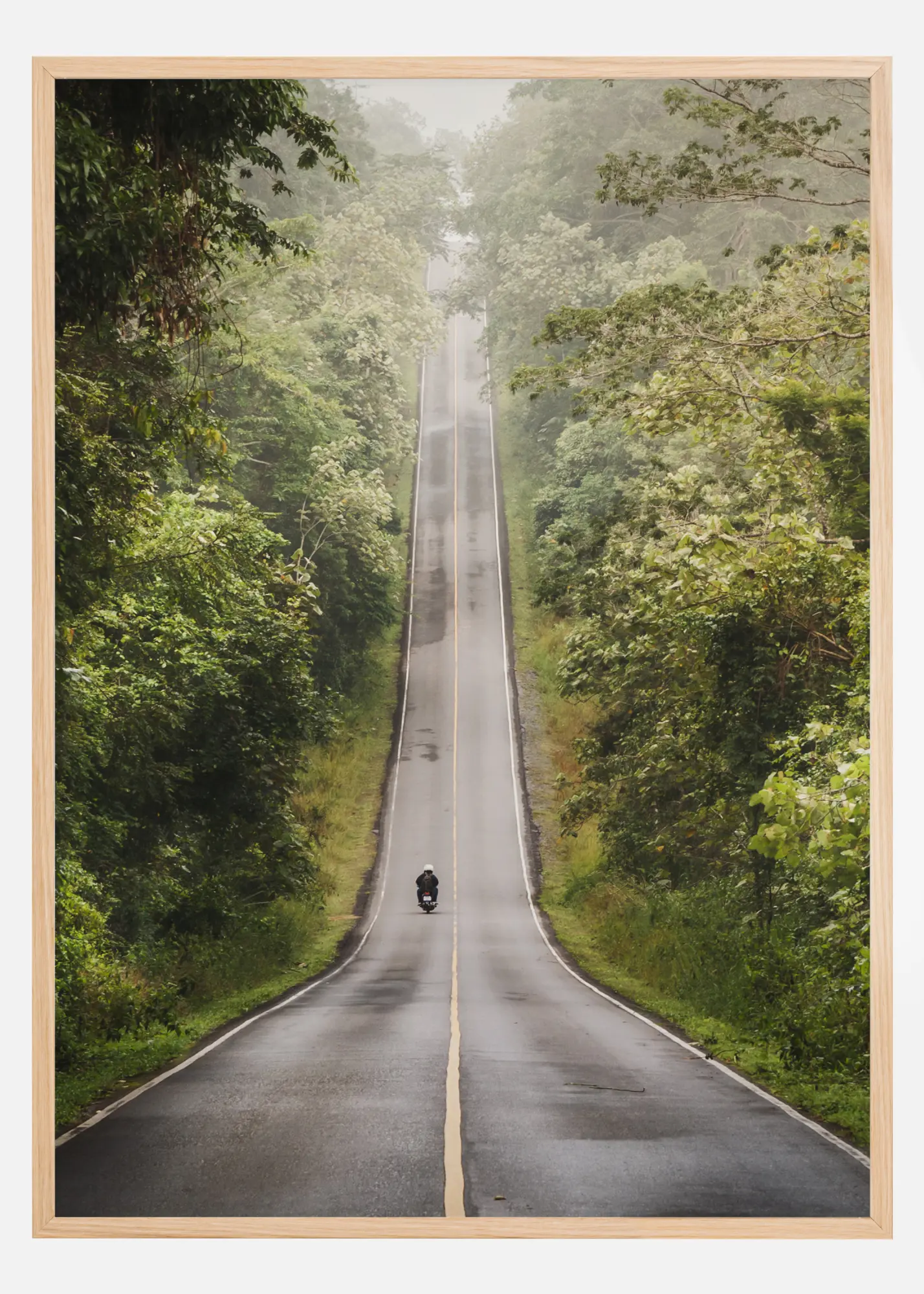 Тиха фотография на път с единствен моторист, която прорязва прекрасна буйна зеленина. Спокоен и релаксиращ плакат, който се съчетава отлично с други любими на по-голяма стена за картини.