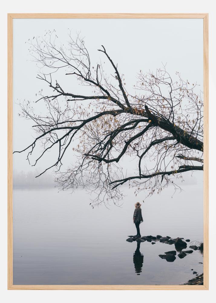 Плакат с изглед към езерото на жена, която стои на малко каменно пристанище в езеро, докато дърво се навежда над нея. Бялото езеро съвпада с небето в същия цвят. Жената изпъква в контраст, докато гледа над водата в спокойно съзерцание. Пренесете спокойствието в дома си с този природен образ.
