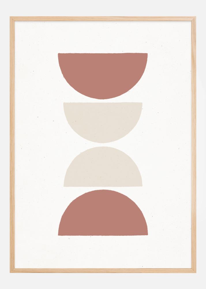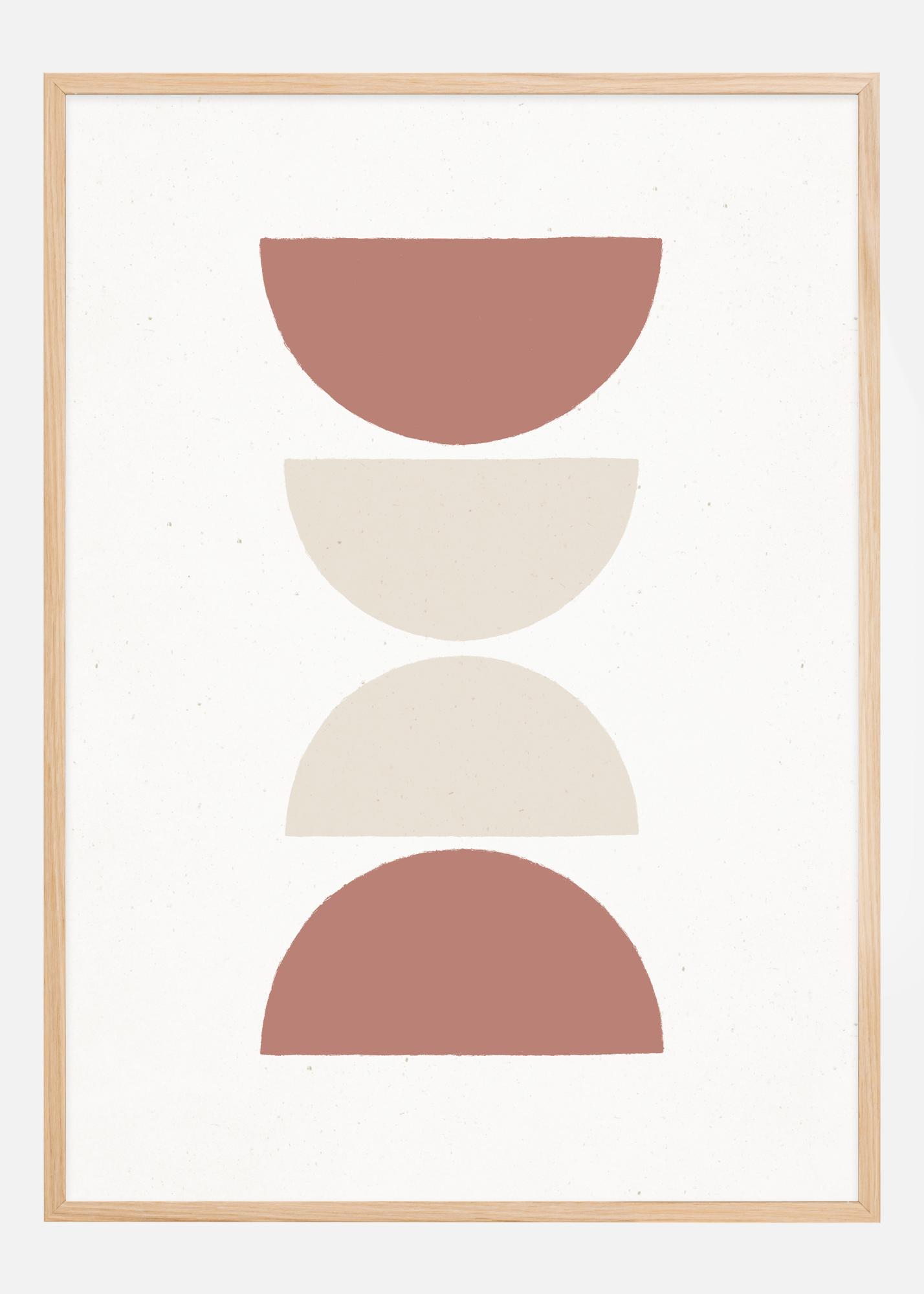 Този изискан постер, озаглавен 'Rust and Sand - Lungo', привлича погледа със своето просто, но смело подреждане на полукръгови форми. Те са наредени един върху друг в успокояваща симетрия, създавайки вертикална динамика върху белия фон. Със своята дискретна палитра от ръждиво червено и пясъчно бежово, този принт е почит към сублимни простотата и придава топло и земно усещане на всяко пространство, в което е поставен.