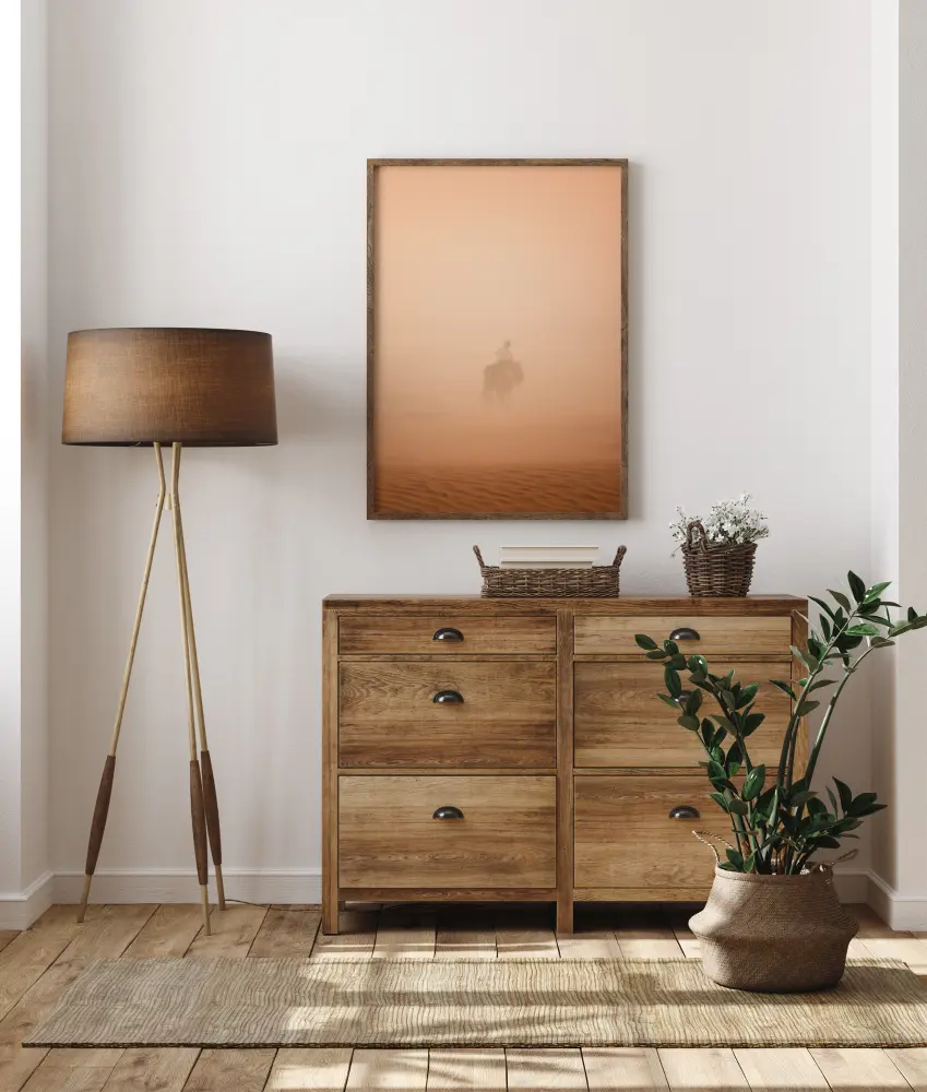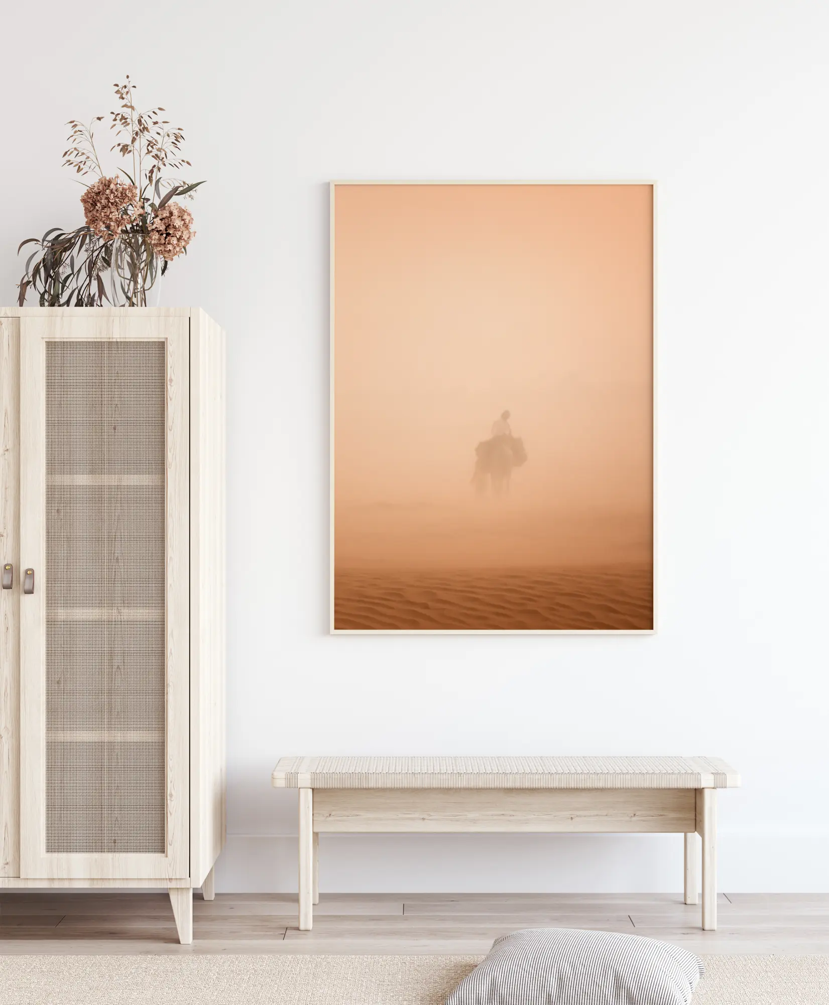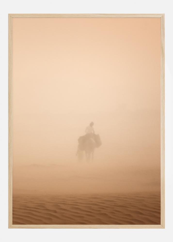 Топъл постер със пясъчна буря. Пясъкът от пустинята се вижда на преден план, преди да се превърне в вихрена мъгла от меки цветове. В средата се вижда неясната форма на фигура, която язди и се бори в бурята. Усетете пустинната топлина.