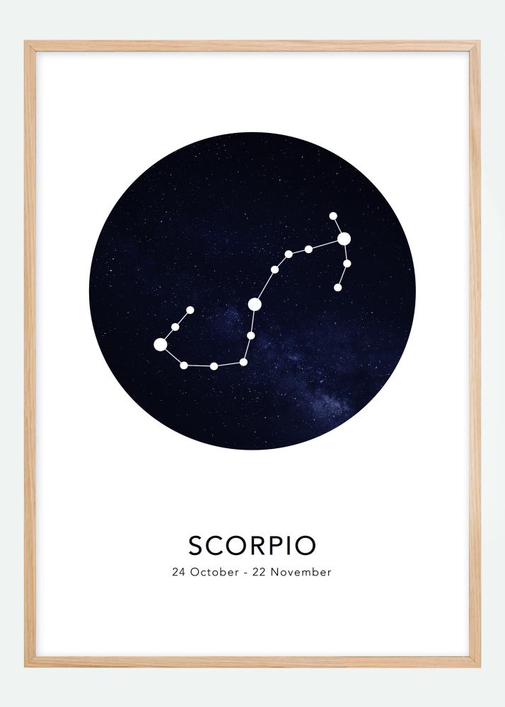 Подарете лично платно на някого, който харесвате! Този стилен плакат има мотив на зодиакалния знак Скорпион върху фон във вид на черно и синьо звездно небе. По-долу е изписано името заедно с актуалните дати на английски.