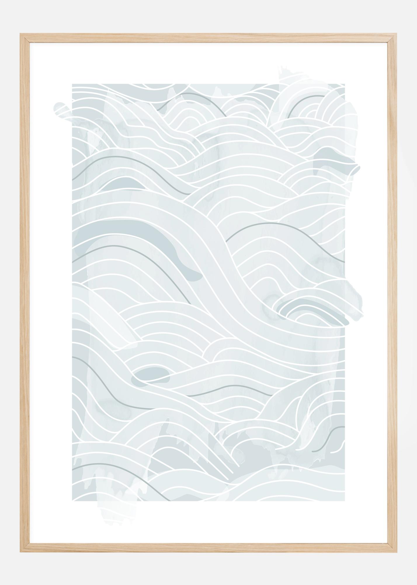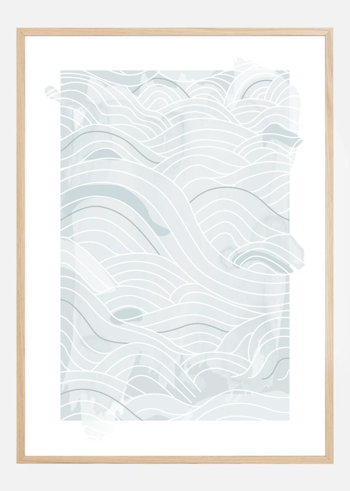Плакат за море с меки сини абстрактни линии и вълни на бял фон. Различни тонове на синьото и различни дебелини на линиите се комбинират, за да създадат тези вълнообразни вълни по страницата. Нека мислите ви се разсеят и се оставете да бъдете увлечени от този мек морски мотив.