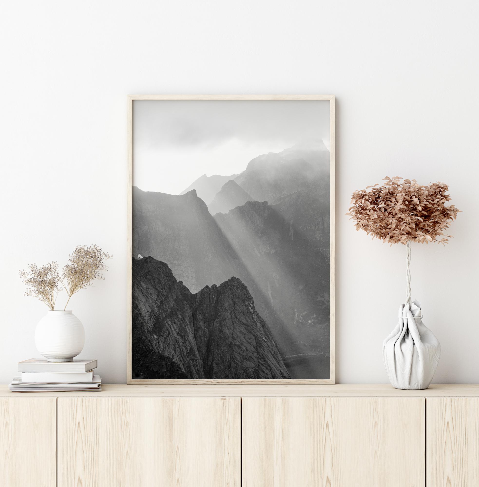 Маджестична пейзажна картина, в която мощен слънчев лъч свети между планините. Тъмните, неравни форми на планинския склон се издигат към ясно бялото небе, където слънцето проблясва. Добавете този невероятен образ на стената си за драматична, но все пак магическа сцена.