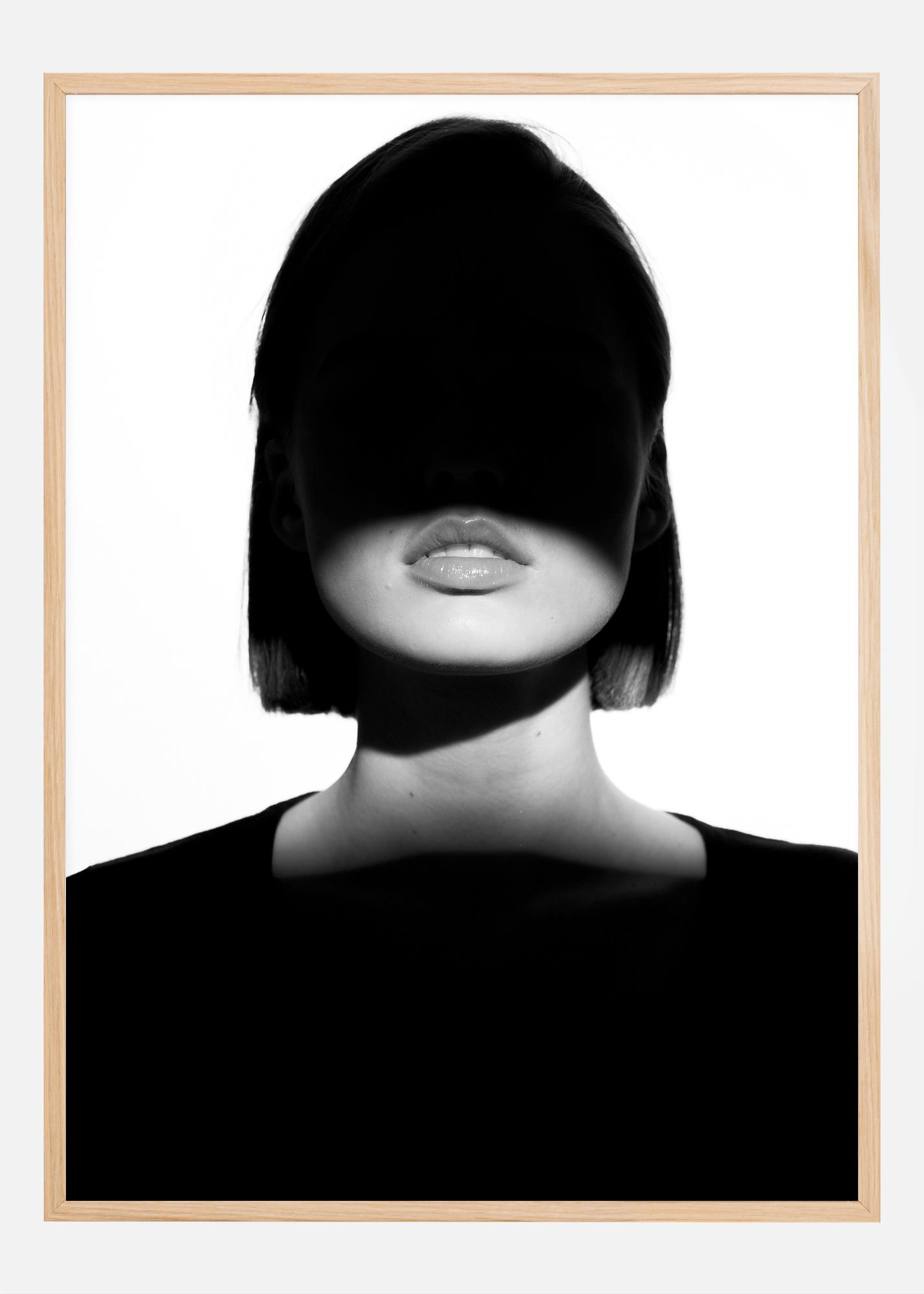 Този впечатляващ постер улавя мощен образ на жена, чиито очи са скрити от тъмна сянка, което създава мистериозен и провокиращ размисъл ефект. Острият контраст между белите акценти и дълбоките черни тонове подчертават нейните изразителни устни и скулптурни черти на лицето. Това е изображение, което балансира на границата между видимост и анонимност, светлина и тъмнина, привличайки зрителя да търси по-дълбок смисъл.