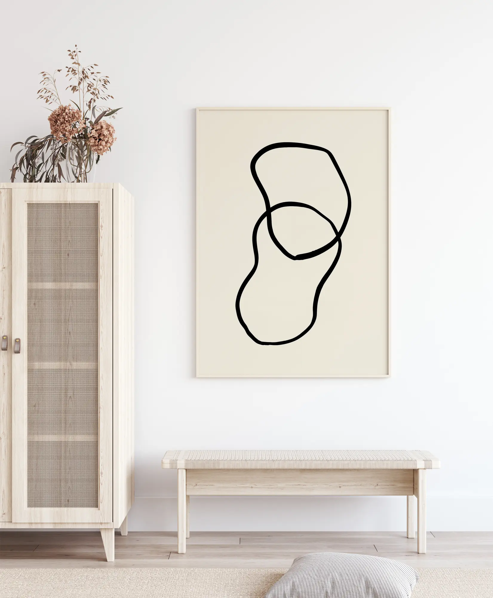 Абстрактен постер с две форми, които се преплитат. Две големи форми са нарисувани с дебели черни линии и се пресичат, за да създадат трета форма. Окачете тази забавна черно-бяла картина на цветна стена, за да получите усещане за модерно изкуство в дома.