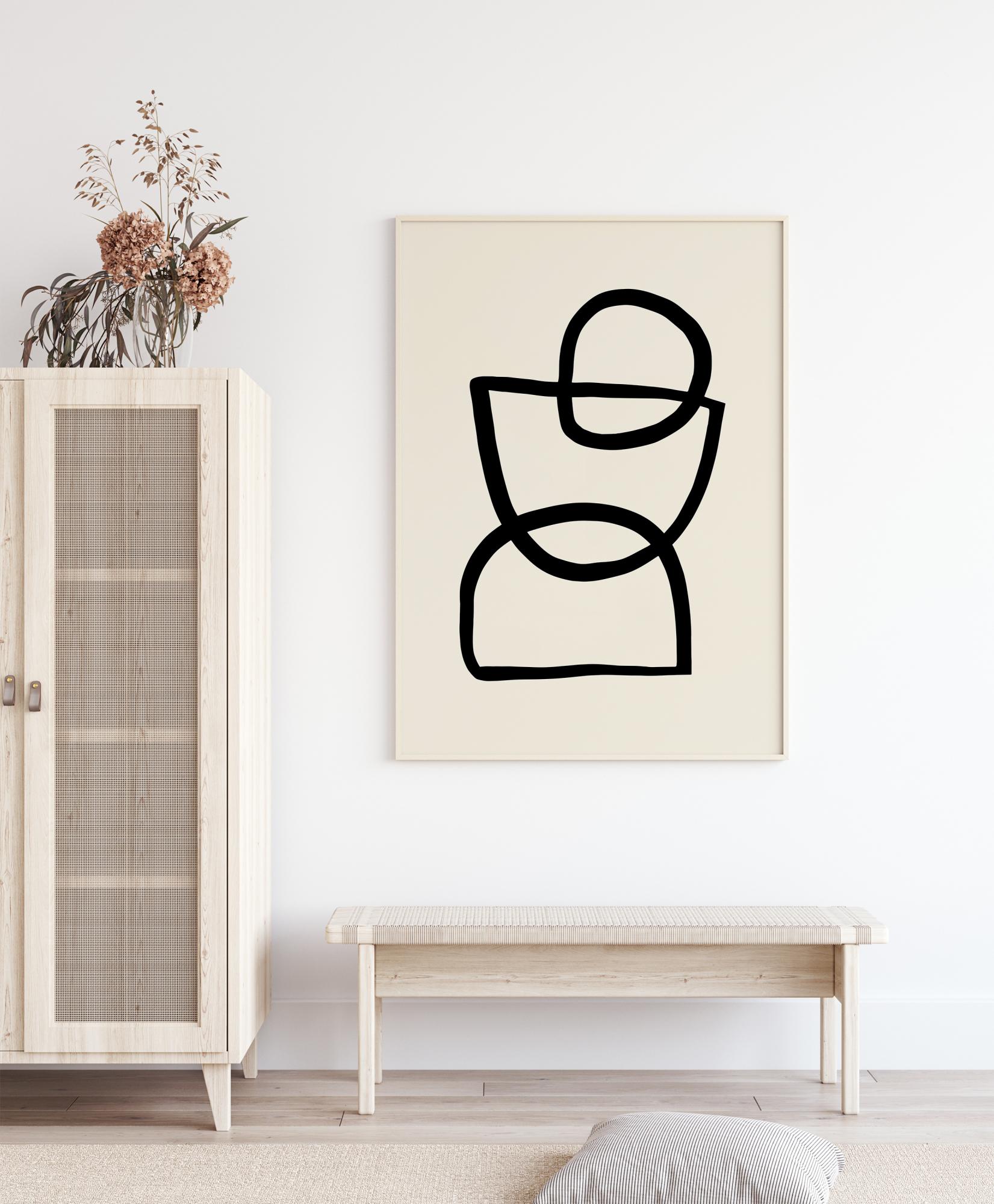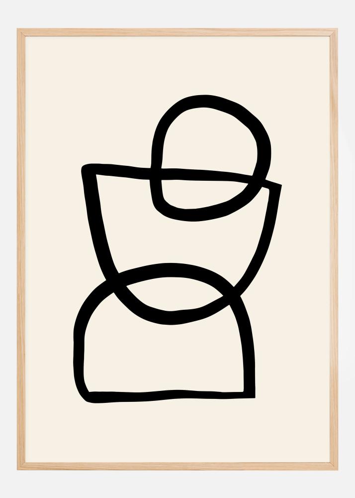 Забавен абстрактен постер с три различни форми, всяка от които е нарисувана с дебела черна линия. Има два полукръга и пълен кръг в горната част. Те се припокриват, за да създадат абстрактен дизайн. Окачете го у дома и интерпретирайте изображението, както желаете. Дали е човек, яйчена чашка или пясъчен часовник? Решението е ваше.
