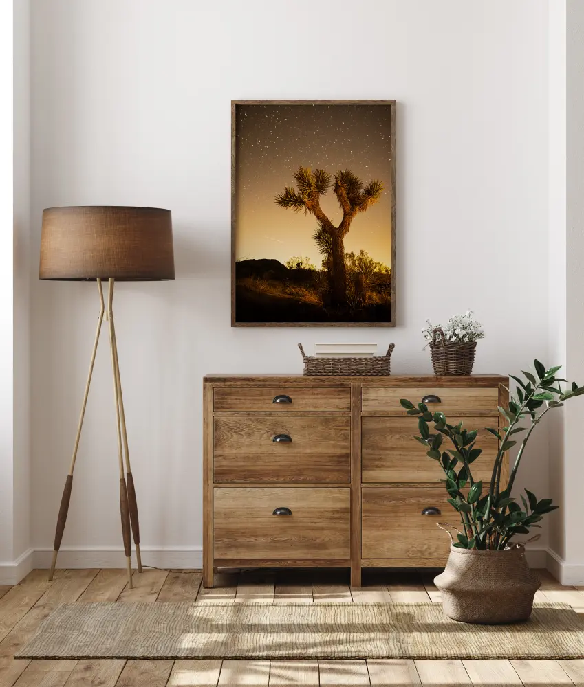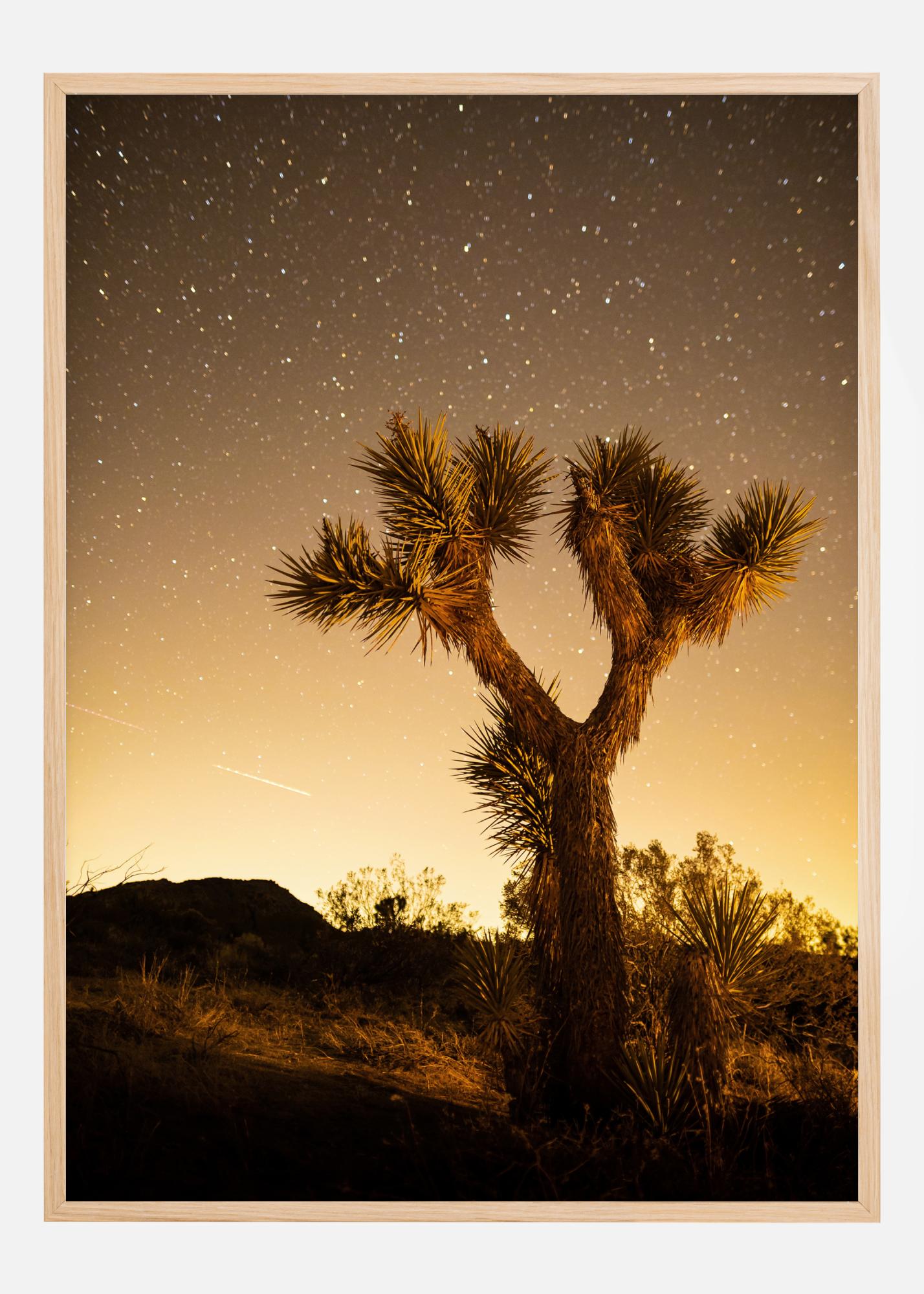 Нощен постер с голям кактус в пустинята, който се извисява срещу звездното нощно небе. Кактусът се къпе в меко златисто сияние, докато слънцето залязва на хоризонта. Звездите нежно мигат над небето в мека и топла нощна атмосфера. Насладете се на топлината на това нощно пустинно небе.