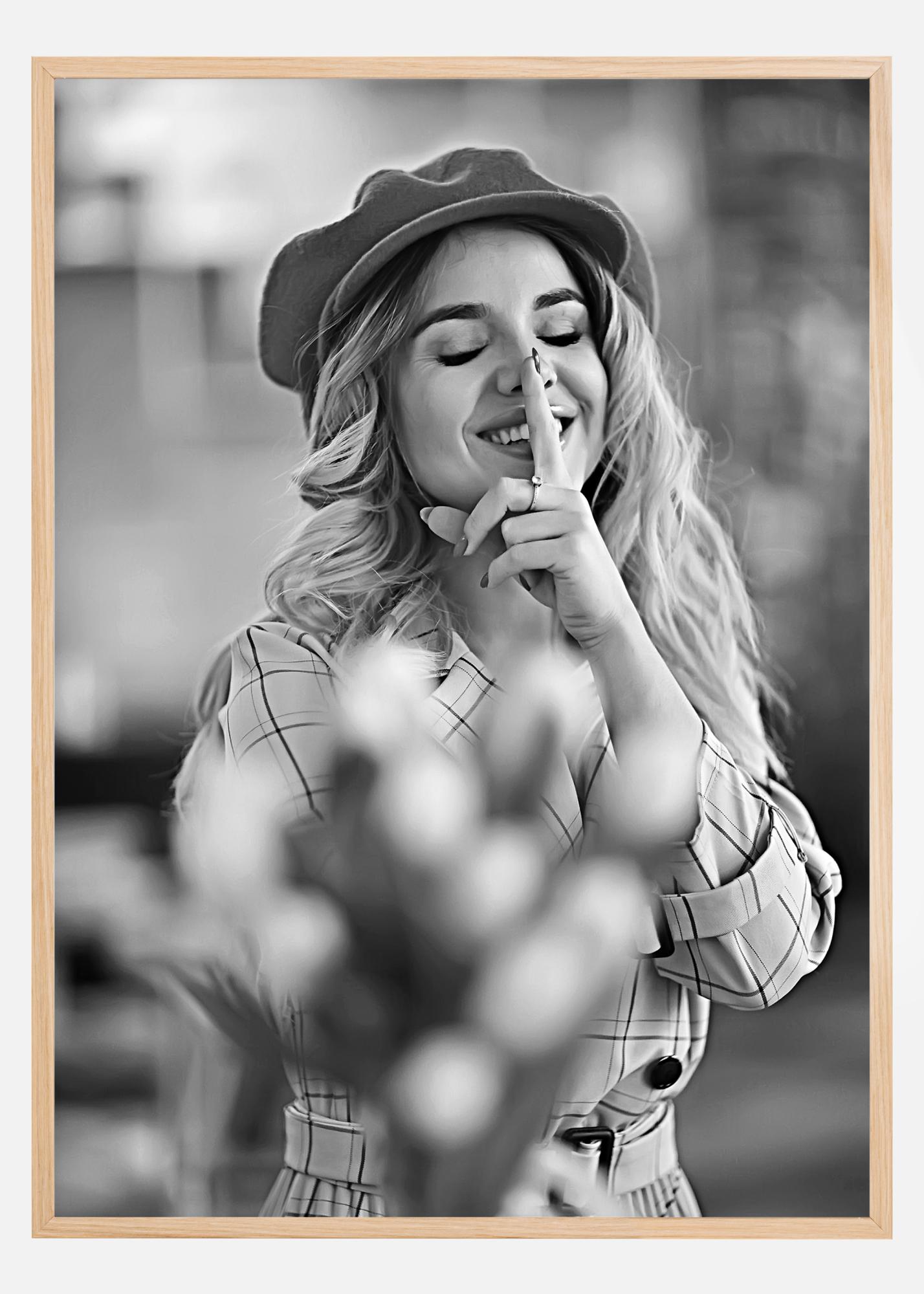 Една дръзка портретна постер с момиче с пръст срещу устните. Русата коса пада под шапката ѝ и това сладко момиче широко се усмихва, когато вдига успокояващ пръст към устните. Това черно-бяло произведение ще подобри настроението ви всеки ден, когато се събудите и го видите.