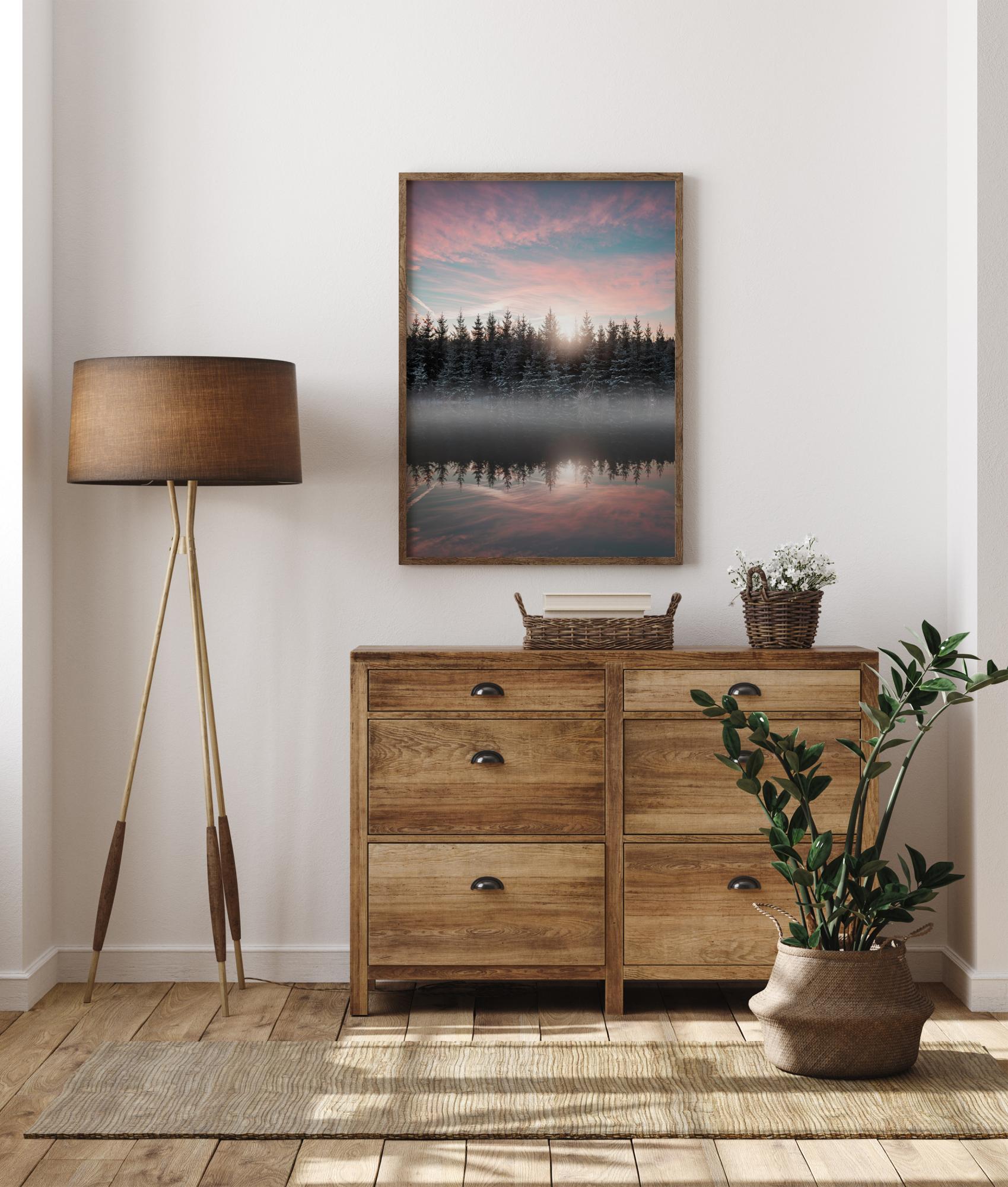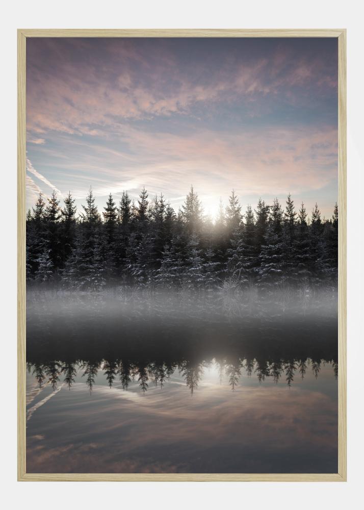 Магичен постер с езеро, обгърнато в мъгла в ранната сутрешна светлина. Със сняг покрити дървета стоят на брега, частично завити в мъгла. Дърветата се отразяват в езерото с меки пастелни цветове. Над върховете на дърветата се издига слънцето и хвърля меко сияние върху розовото и синьо небе за спокойна атмосфера.