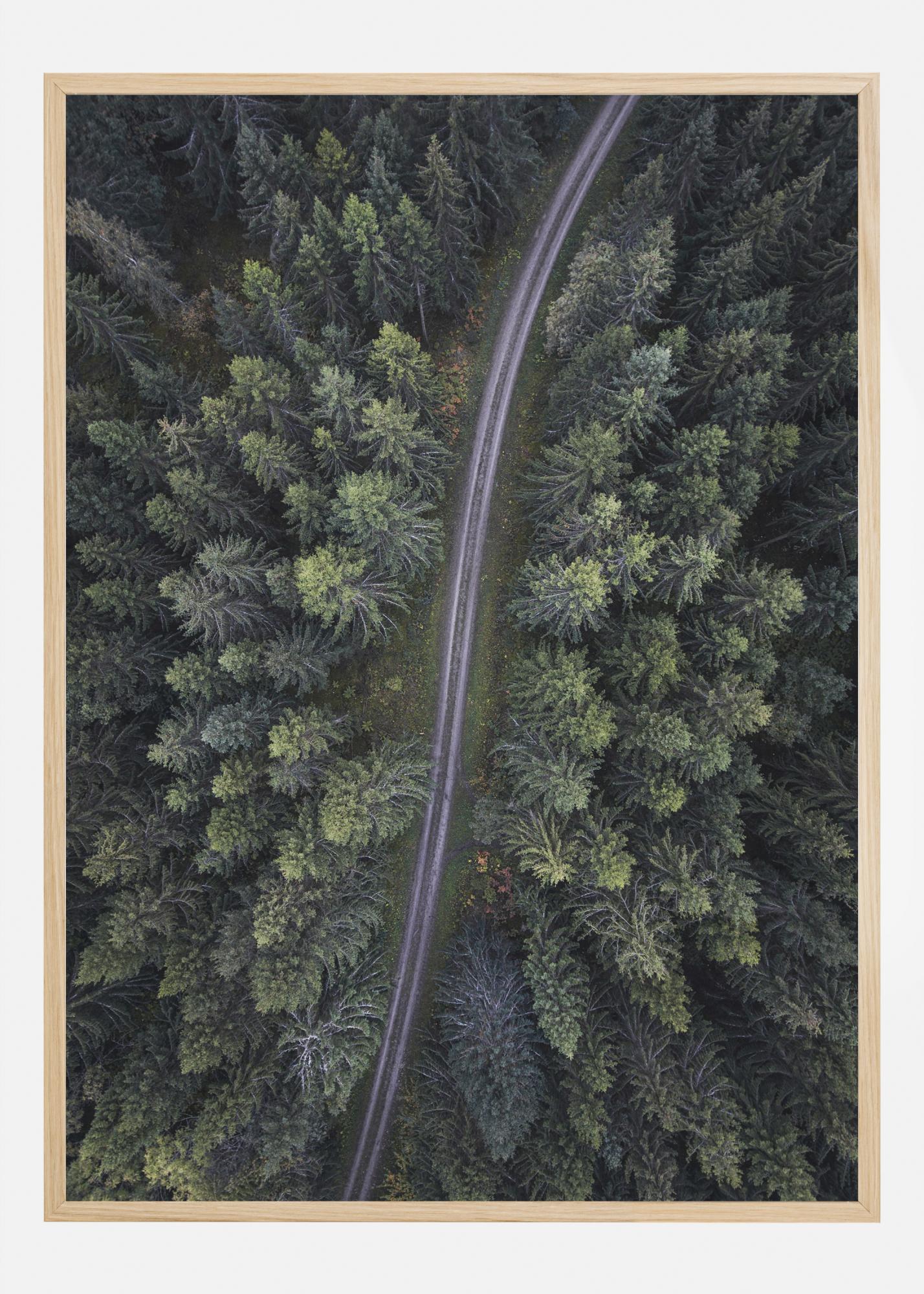 Постер с въздушна снимка на път, който прорязва зелена гора. Високи смърчове ограждат пътя и се извисяват нагоре, отваряйки се около пътя, който минава между тях. Формата изглежда като цвете и създава убедителен модел, перфектен за мека зелена стена.