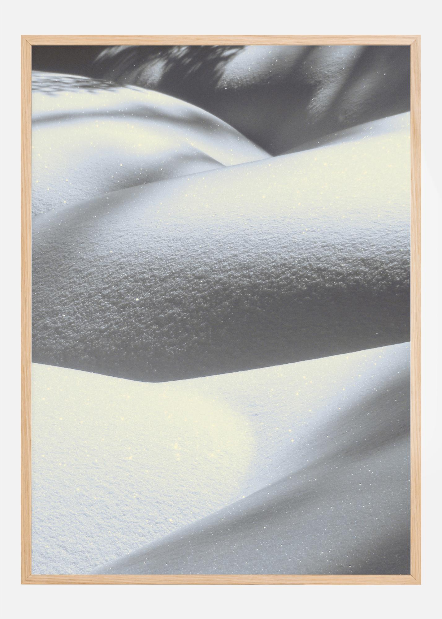 Бял постер със сняг по вълнообразни хълмове. Това изображение е смесица от бяло и сиво, когато снегът се стелва над пейзажа и създава различни шарки и форми. Снегът покрива всичко и оставя всичко на вашето въображение, точно както това изображение.