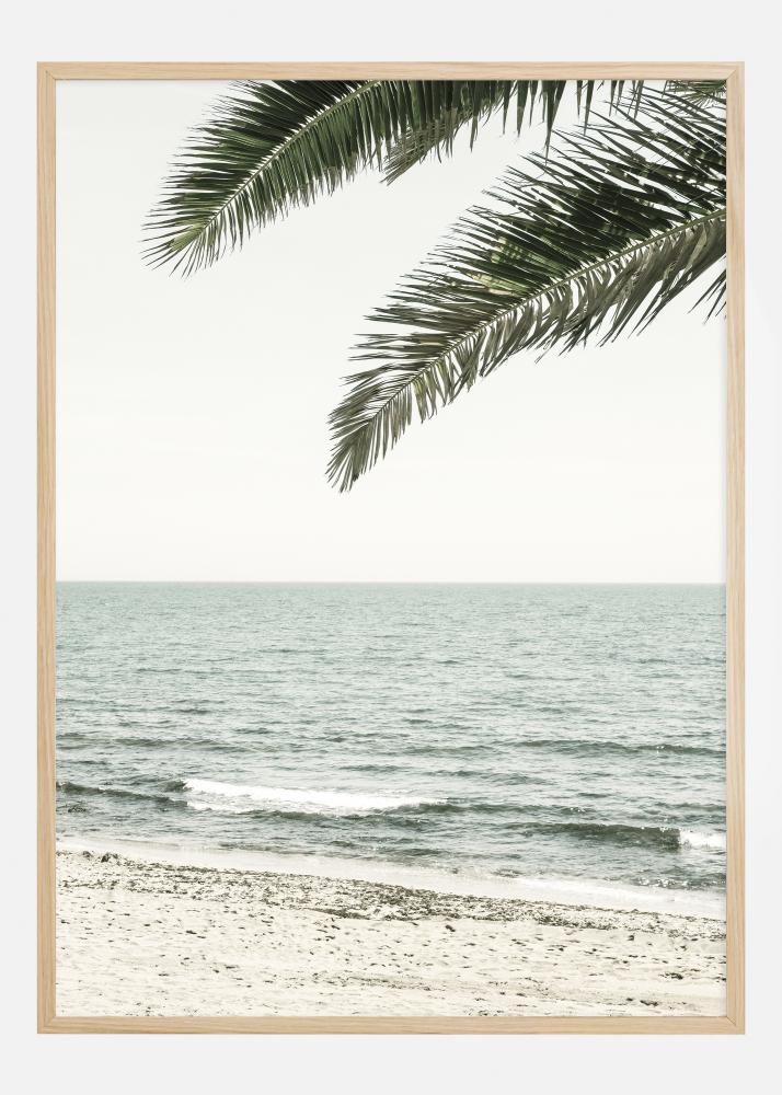 Почувствайте спокойната атмосфера на тропическо убежище с този постер, който улавя гледка на размахващи се палмови листа срещу ясносиньо небе и тихо море. Успокояващата плажна сцена е обградена от живописни зелени листа, което създава естествен прозоречен ефект и приканва наблюдателя да мечтае за по-топли места.