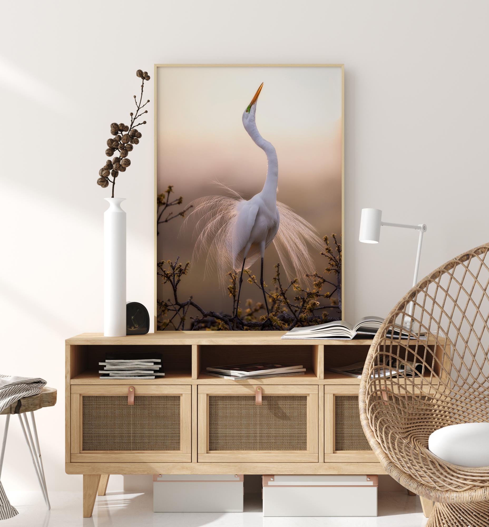 Плакат с животно с щъркел, който танцува на сутрешната светлина. Величественото бяло тяло на щъркела срещу мекото залезно слънце, което свети през перата, създава сюрреалистична сцена. Събуждайте се всяка сутрин с усещане за възхищение с помощта на този печат.