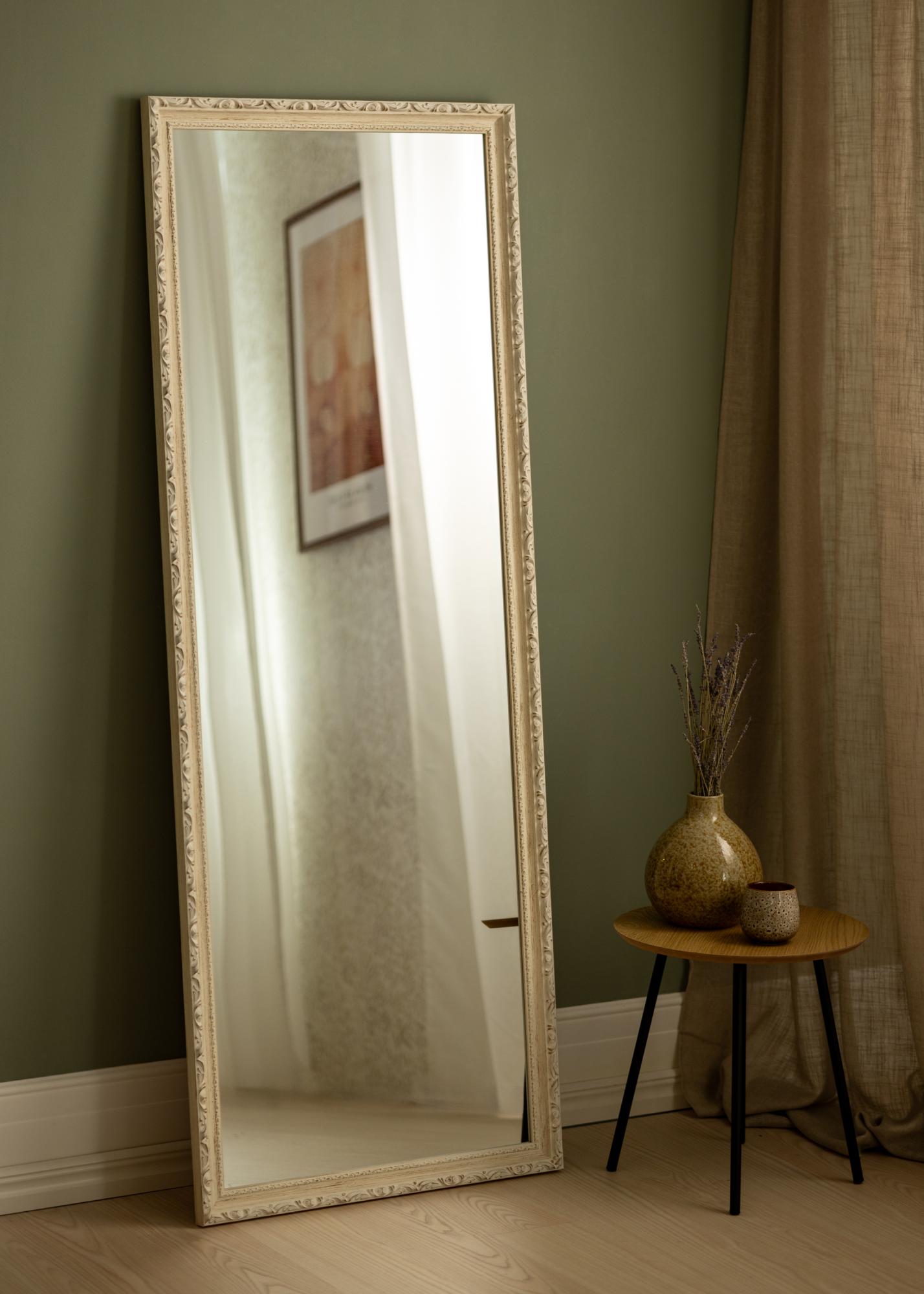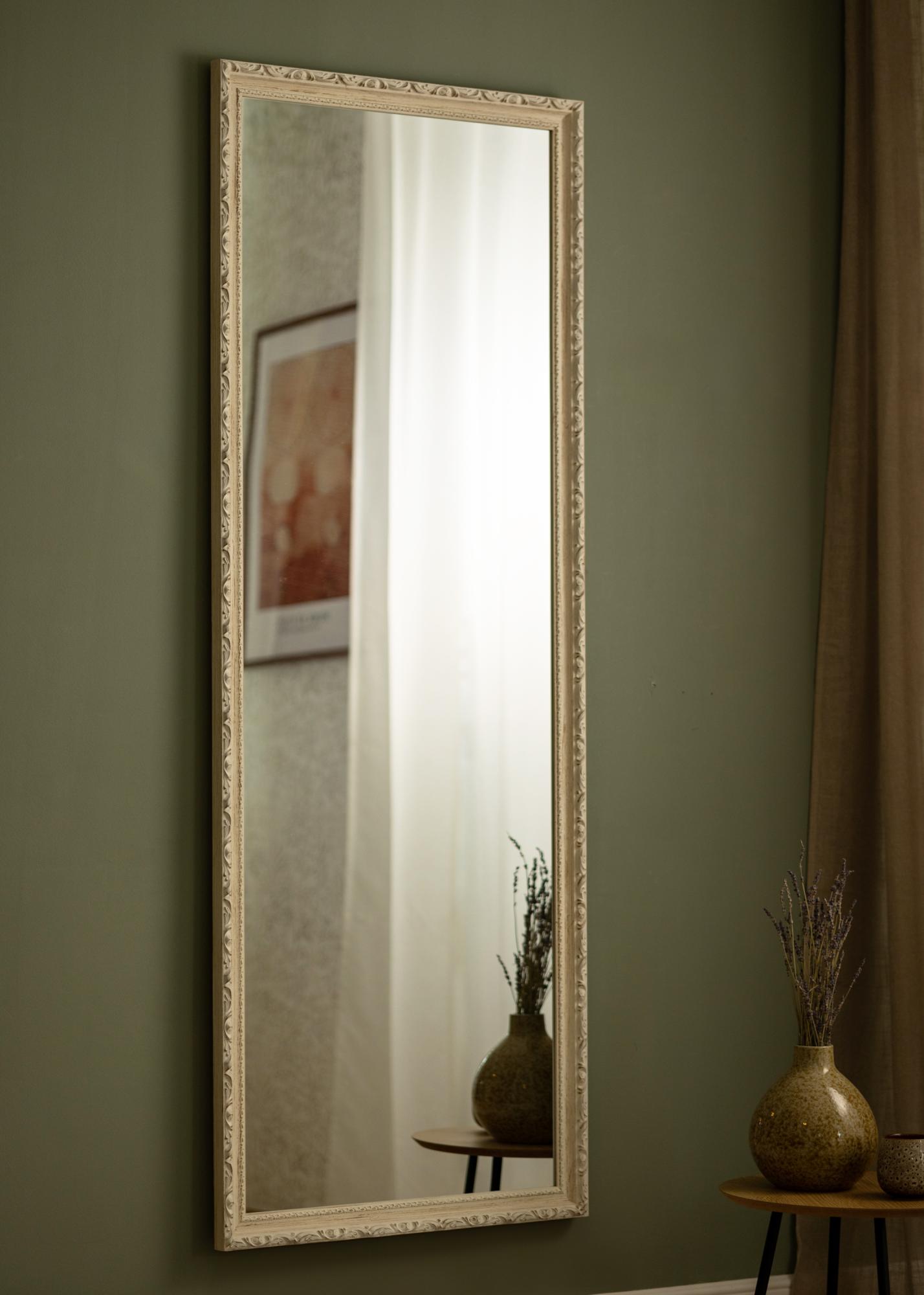 Бяло огледало в античен стил с видими дървесни нишки и ширина от 40 мм. Отличен избор, когато търсите огледало, което се откроява и заема място.