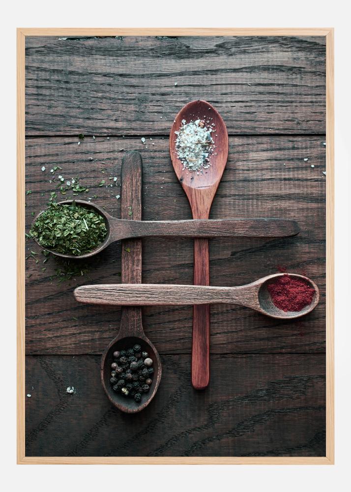 Постер на натюрморт с четири дървени лъжици, всяка от които съдържа подправка. Четирите лъжици се пресичат и образуват мрежа върху рустикална дървена маса. Билки и подправки се разливат от всяка лъжица и създават забавна кулинарна атмосфера, идеална за вашето вдъхновение в кухнята.