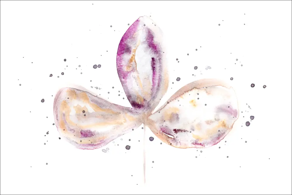 Ярък плакат с три лилави венчелистчета в средата на бял фон. Различни лилави тонове създават тези меки разширяващи се листа. Точки от лилав цвят се разпръскват от листата за по-абстрактно усещане. Подчертайте цветовете, като закачите този плакат на лилава стена.