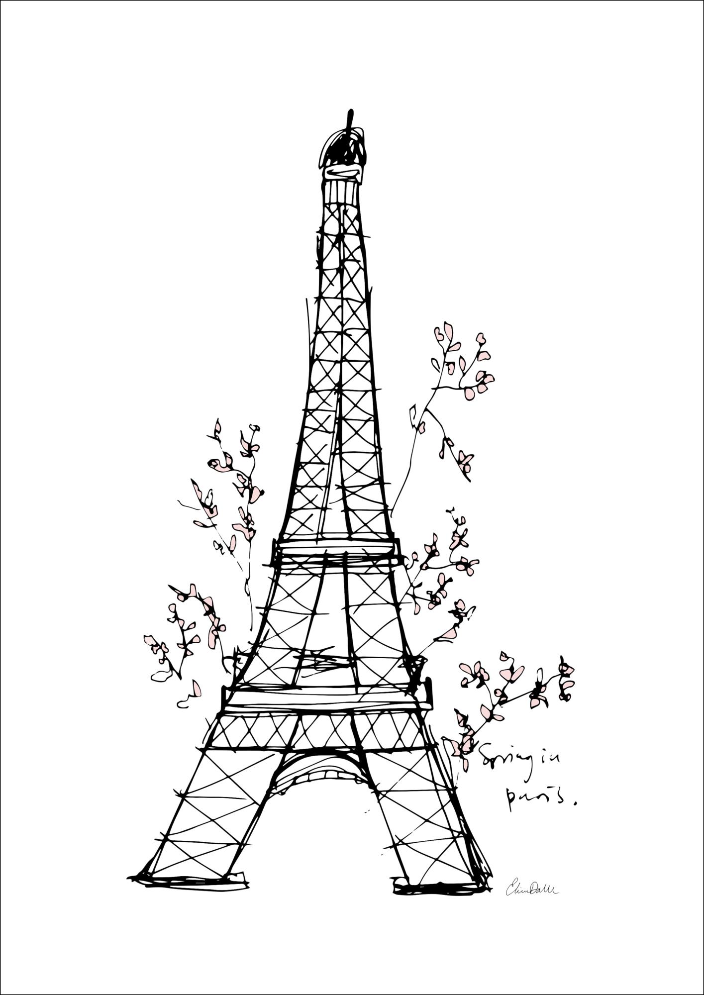 Плакат с проста рисунка с мастило на Айфеловата кула. Драскащите линии в изображението и неравномерното поставяне на кулата в центъра допринасят за илюстративното качество. Големи цъфтящи клони се простират зад кулата, за да придадат това пролетно усещане в Париж.