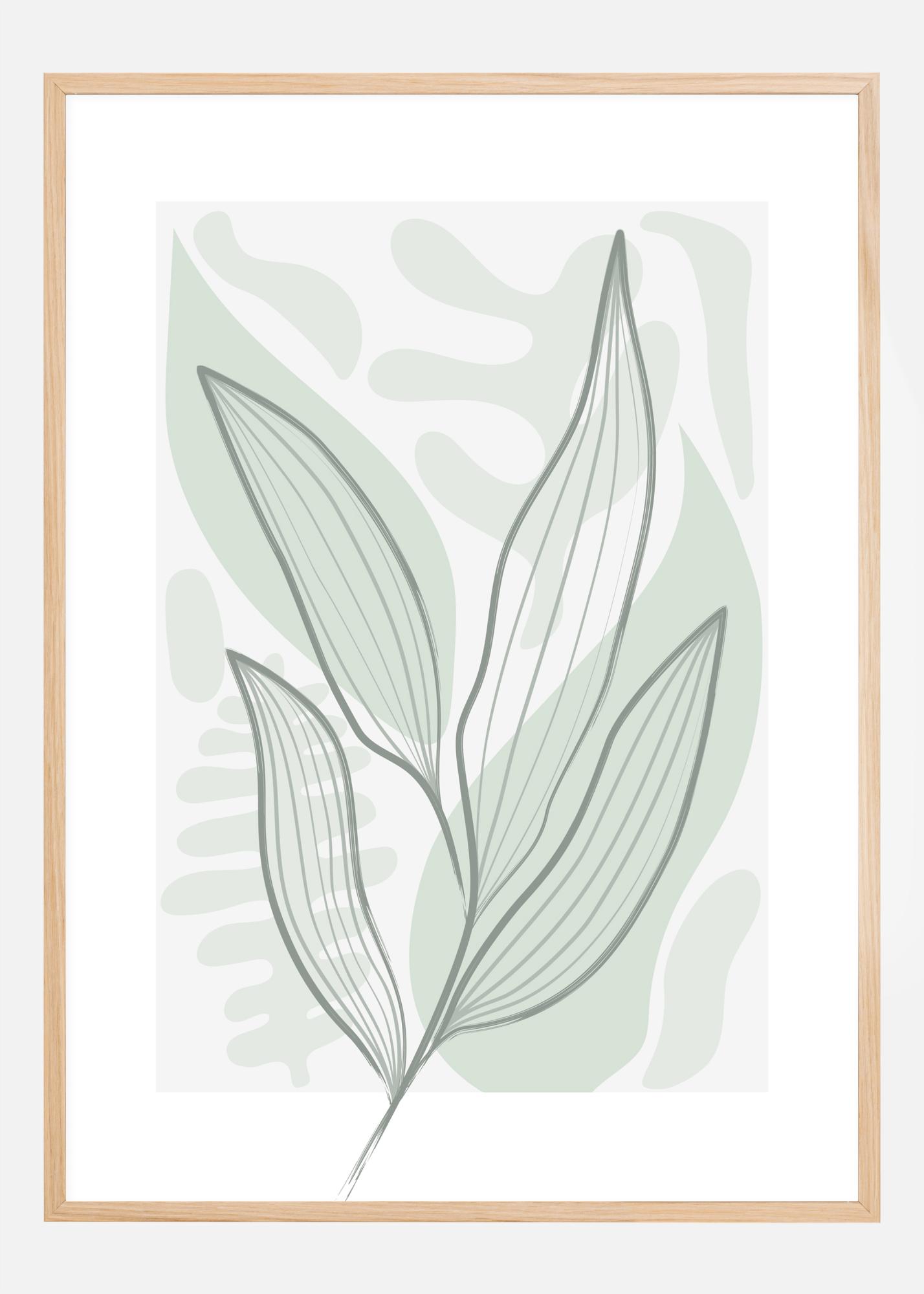 Абстрактен постер с листа на прост зелен фон с различни форми на листа и шарки. С меките зелени и сиви цветове, простият дизайн на листата, който е очертан от силна сива линия, придава силно, но меко пролетно усещане, което може да бъде окачено във всяка стая на дома.