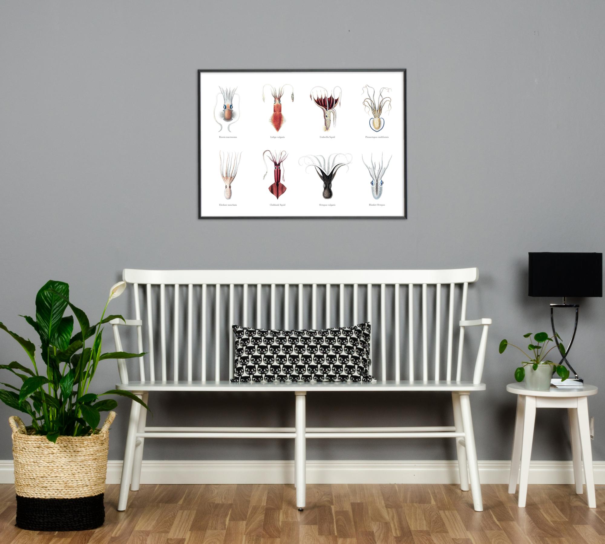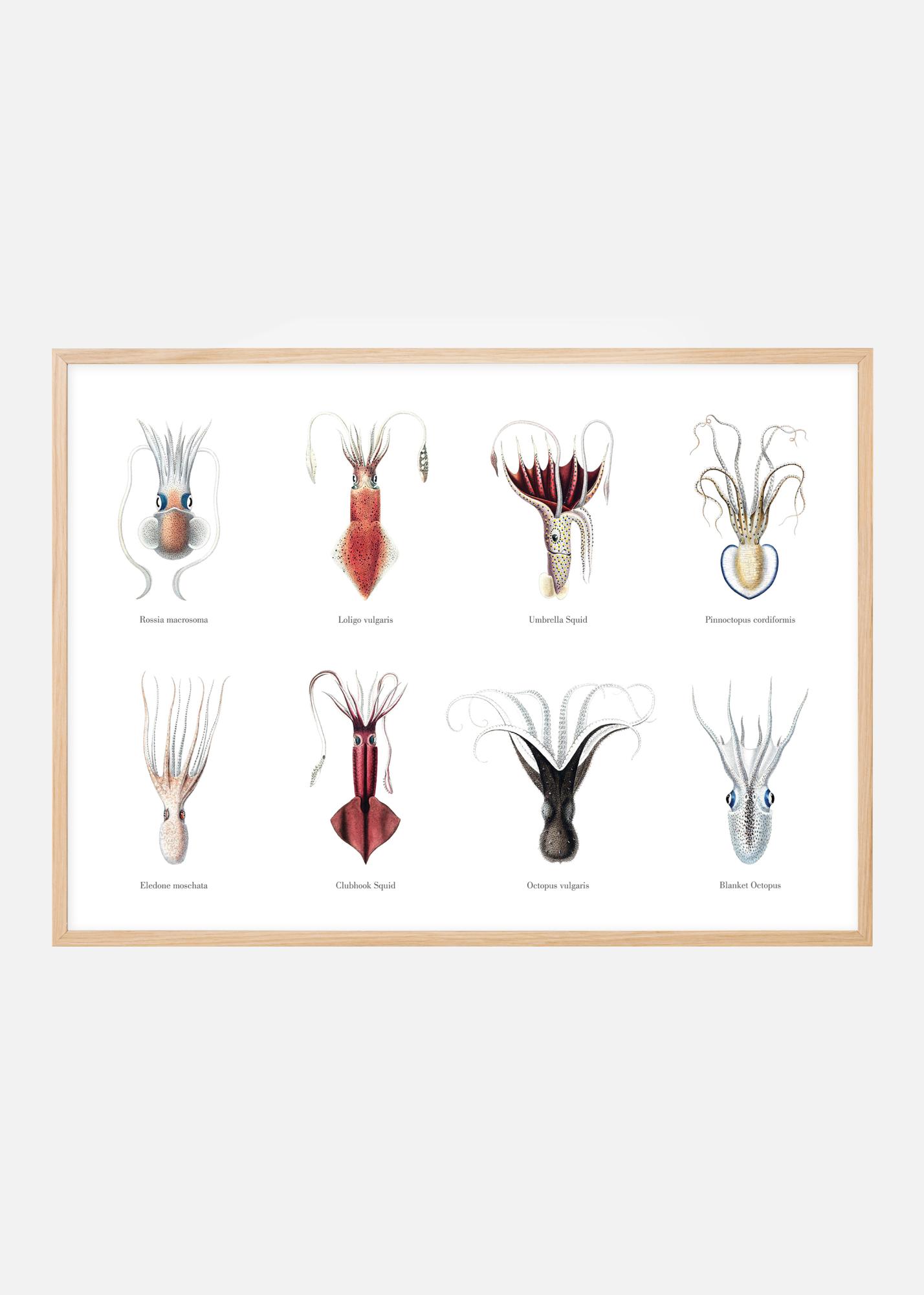 Октоподът е наистина интересно същество. Знаете ли например, че има 3 сърца? Или че неговият интелигентен мозък е изключително малък, въпреки че огромното нещо, което изглежда като глава, сякаш съдържа един голям мозък? Допълнително има почти 800 вида октоподи! Този красив винтидж плакат изобразява 8 от тях - никой не прилича на другия, но всички са еднакво завладяващи. Старите рисунки имат сладки, добре изработени детайли и под всеки вид е написано името му.