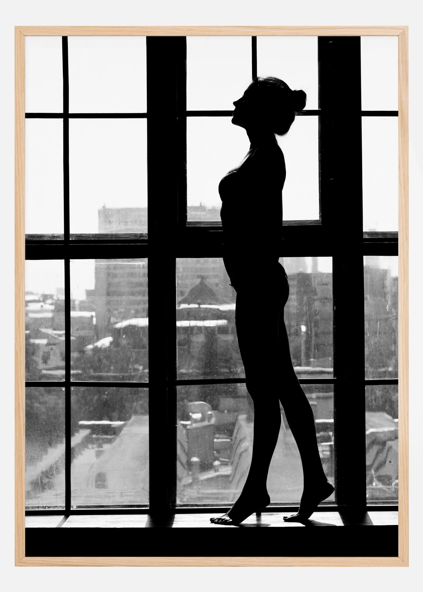 Фотографско изкуство в сивотон на жена, която стои пред голям индустриален прозорец. Противосветлината превръща жената в тъмен силует срещу града отвън. Стилен постер, идеален за комбиниране с други любими произведения на по-голяма стена за картини.