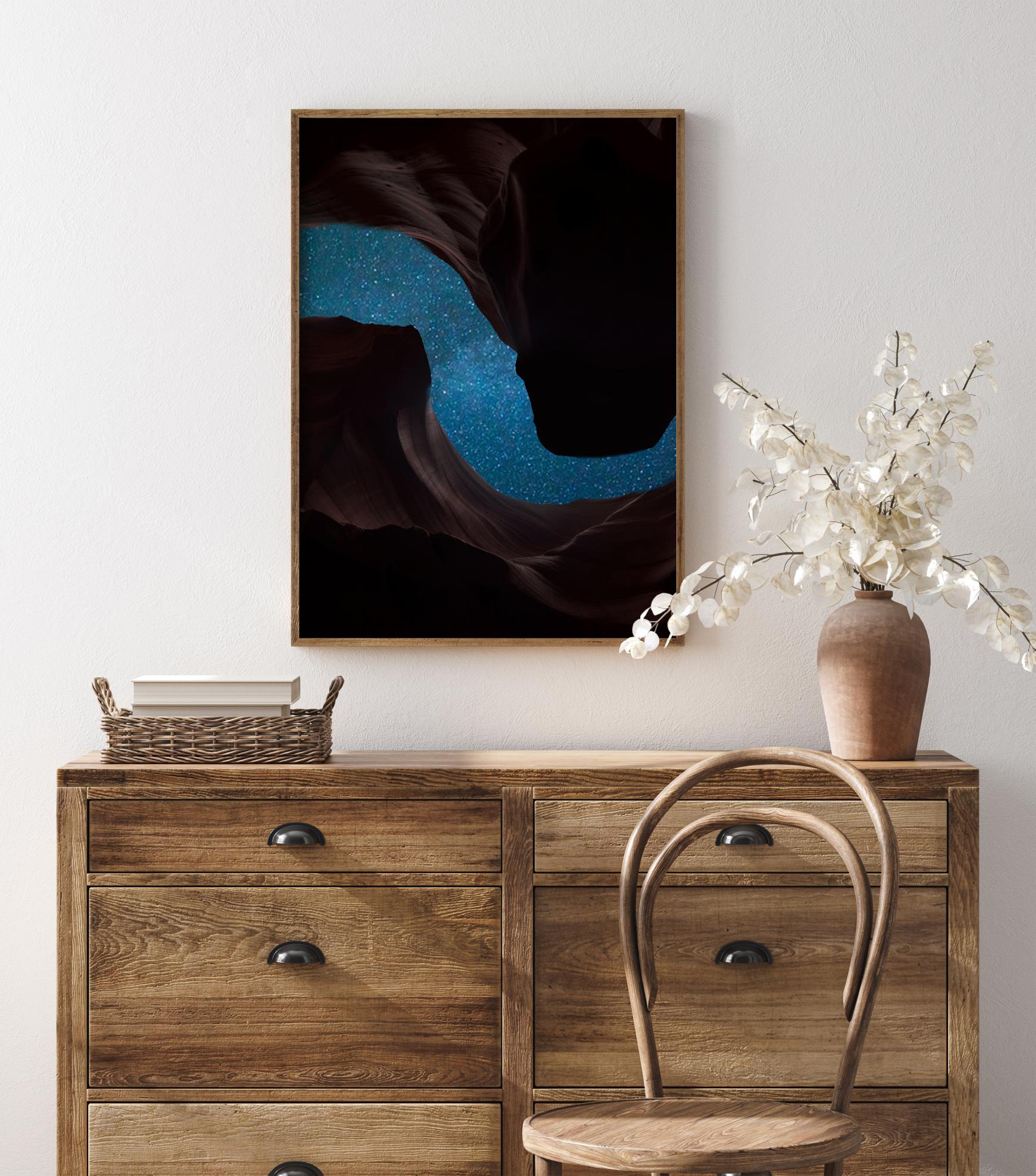 Един великолепен нощен постер със звездно небе, което се показва между няколко драматични скални образувания. Дълбоко червените скали се завихрят около върха и дъното на снимката, създавайки звездния път, през който нощното небе да проблесне в това живо изображение, създадено за да предизвика благоговение.