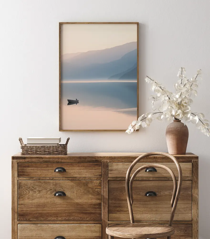 Един спокоен постер с лодка в средата на голямо езеро. Тази вечерна снимка е нищо друго освен спокойствие. Едно тихо езеро отразява пастелносиньо от планините зад него, за да създаде тишина и покой, които ще проникнат дори във вашия дом.