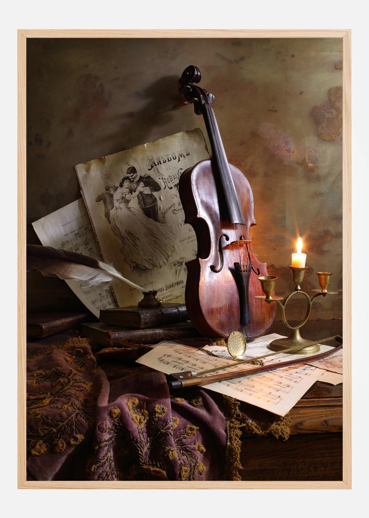 Постер с натюрморт на тема цигулка и нотни листове. Мека светлина ярко осветява махагоновия цвят на цигулката, когато тя стои до стената. Плат, нотни листове, перодръжка, лък и други аксесоари запълват сцената и придават на стаята топло и удовлетворяващо усещане.