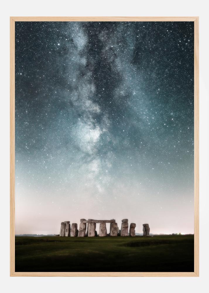 Един известен плакат на забележителност със Стоунхендж на фона на драматично звездна нощно небе. Тази широка снимка се фокусира върху драматичния Млечен път, който се простира през синьото небе, изпълнено със звезди. Проследете галактиката надолу, докато видите Стоунхендж като малка каменна формация в долната част на изображението, за да получите различен поглед върху това впечатляващо световно чудо.