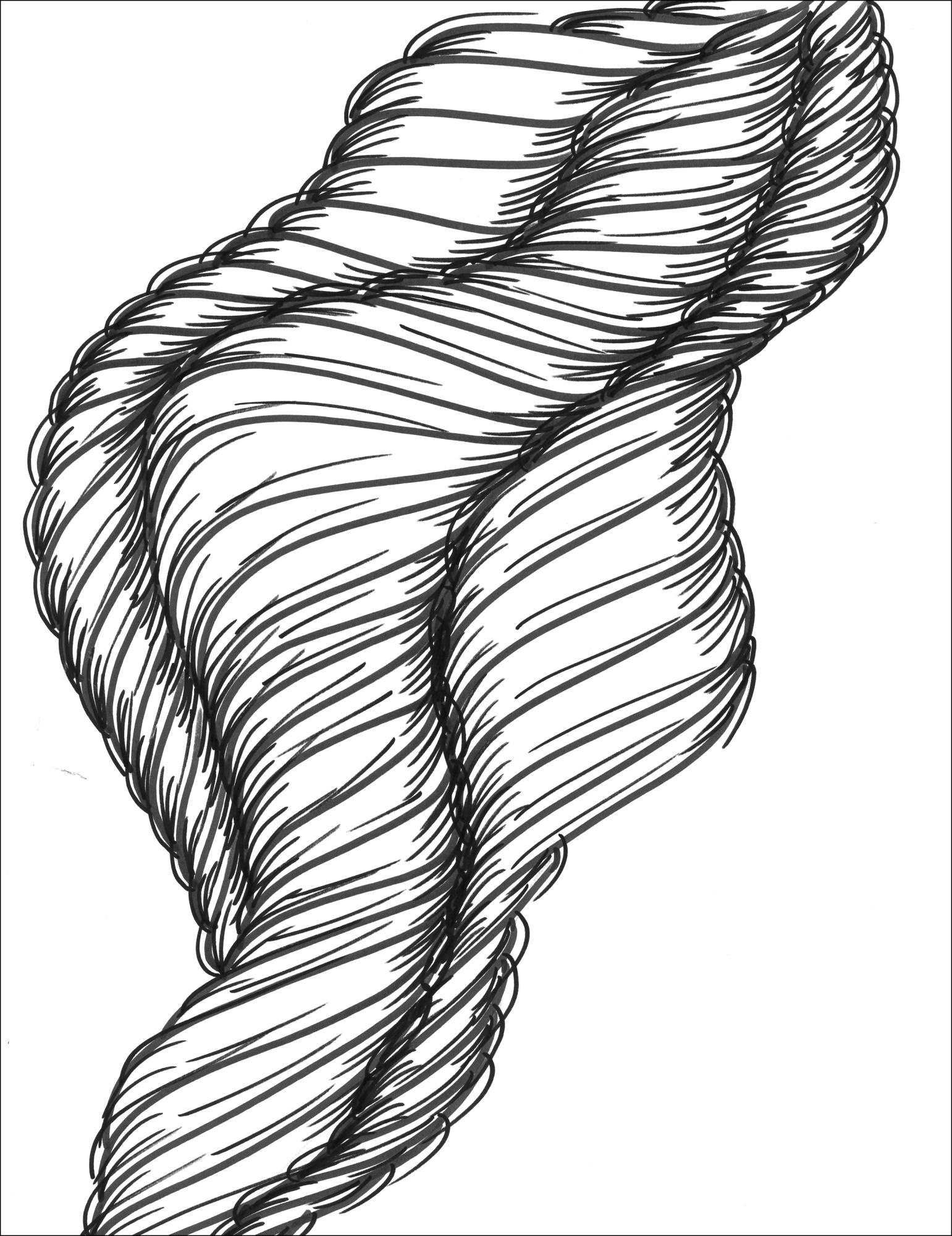 Вихрящ се абстрактен постер с черни линии, които се преплитат, за да създадат формата на торнадо. Три черни линейни спирали се връзват заедно на бял фон. Дебелите и тънките линии създават почти движещ се образ, който води погледа, докато се движи над творбата.
