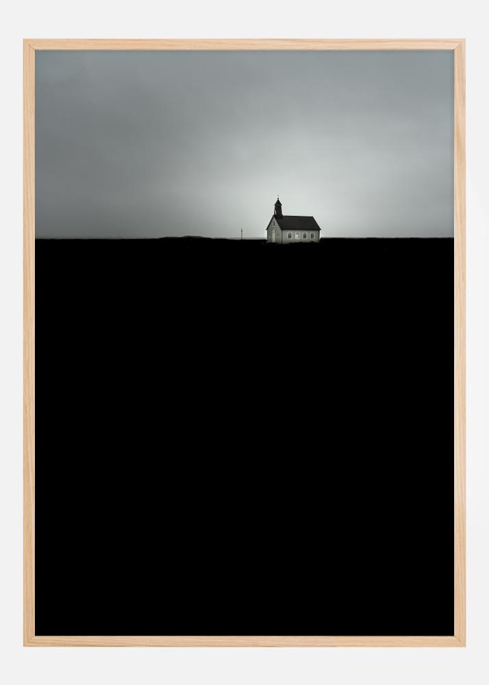 Този постер представя силен и въздействащ образ на Страндаркиркя, самотна църква, която стои срещу драматично небе. Тъмният силует на пейзажа създава рязък контраст с сивото небе, което придава усещане за изолация и тишина. Белите стени на църквата осветяват пейзажа и предлагат символ на надежда и упътване в заобикалящия мрак.