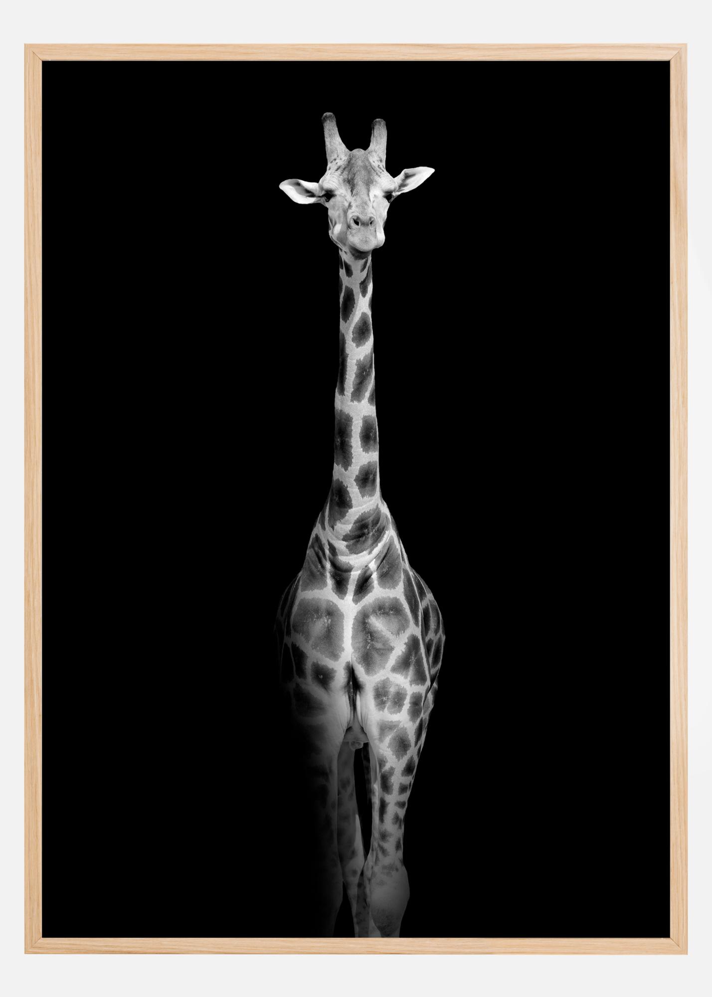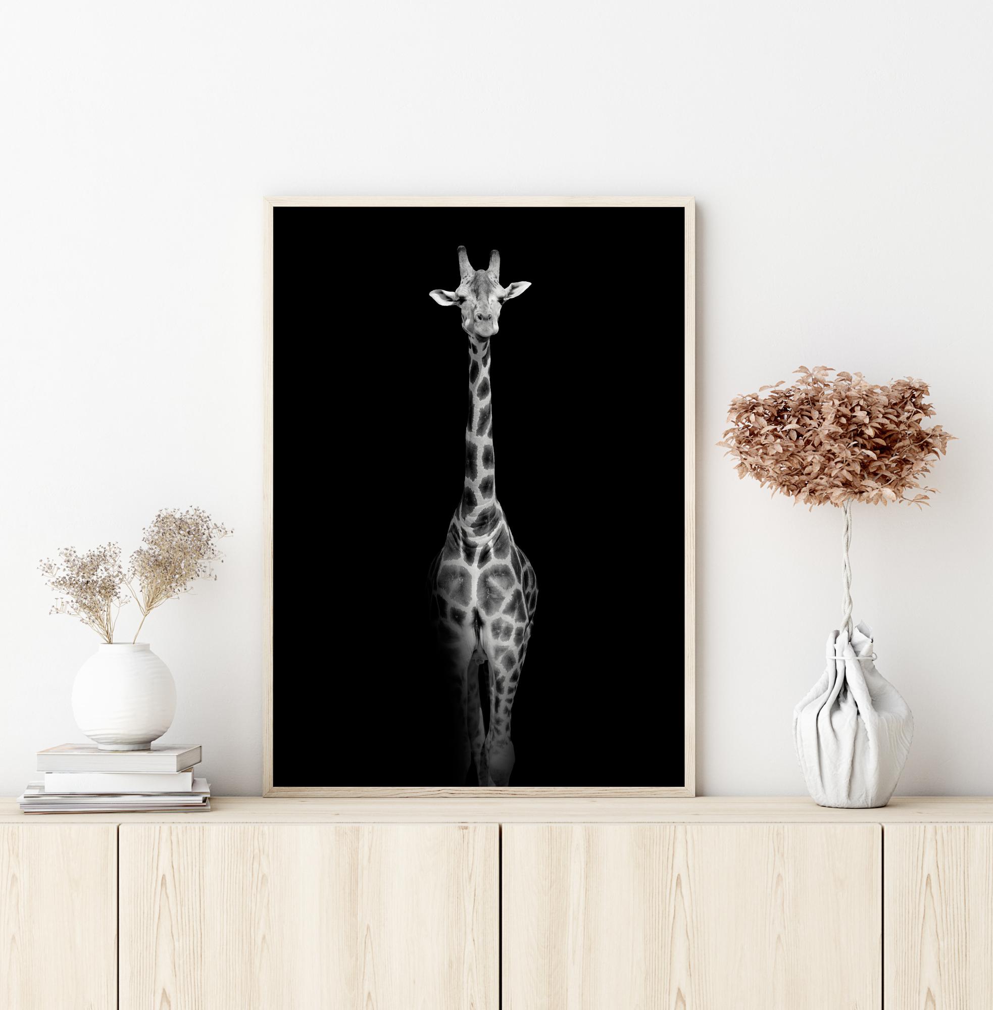 Фотографско изкуство в черно и бяло на извисяващ се жираф, който излиза от черния фон на изображението. Стилен и контрастен плакат с приятно дълбочина. Комбинирайте с други от нашите красиви животински плакати в същия стил за стена с картини на същата тема.