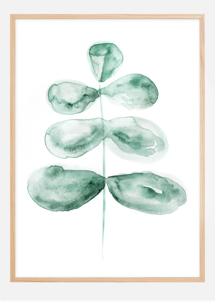 Един семпъл плакат със сини и зелени листа, нарисувани с акварелни бои. Цветът се разтича във всяко листо, оставяйки краищата меки и разфокусирани, за да придаде живописен вид. Тънко стъбло свързва листата в непрекъснато цяло в тази елегантна картина. Съчетавайте с меки пастелни цветове, за да завършите лятното усещане.